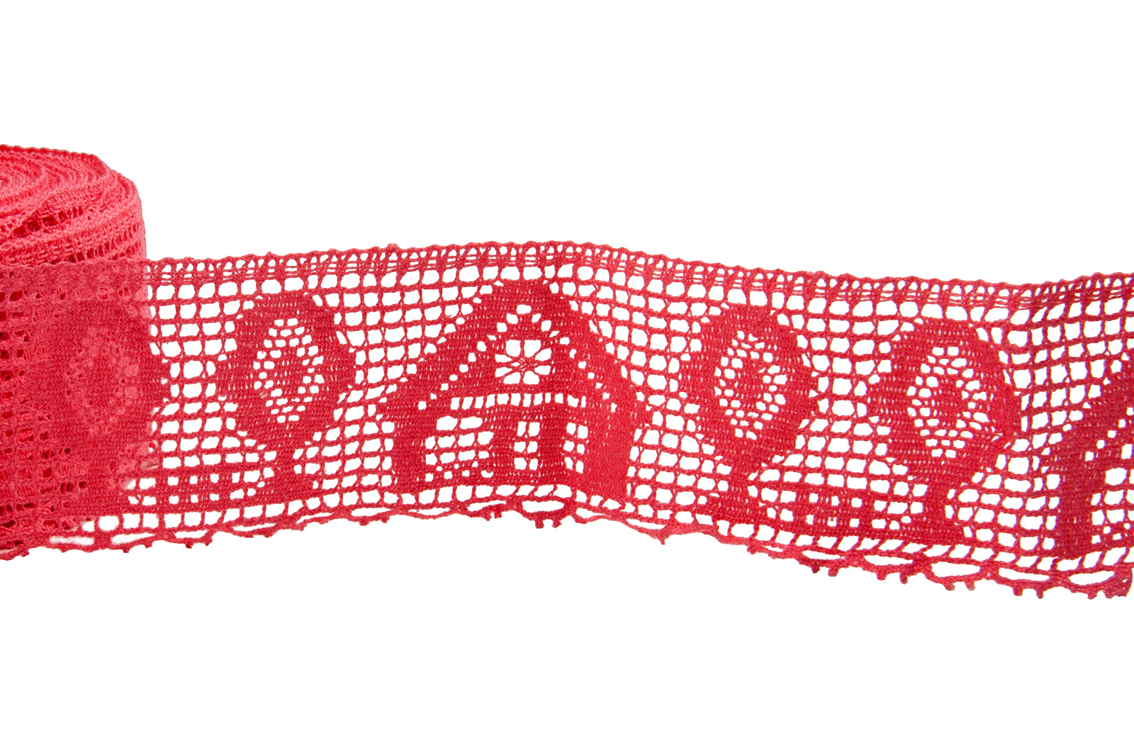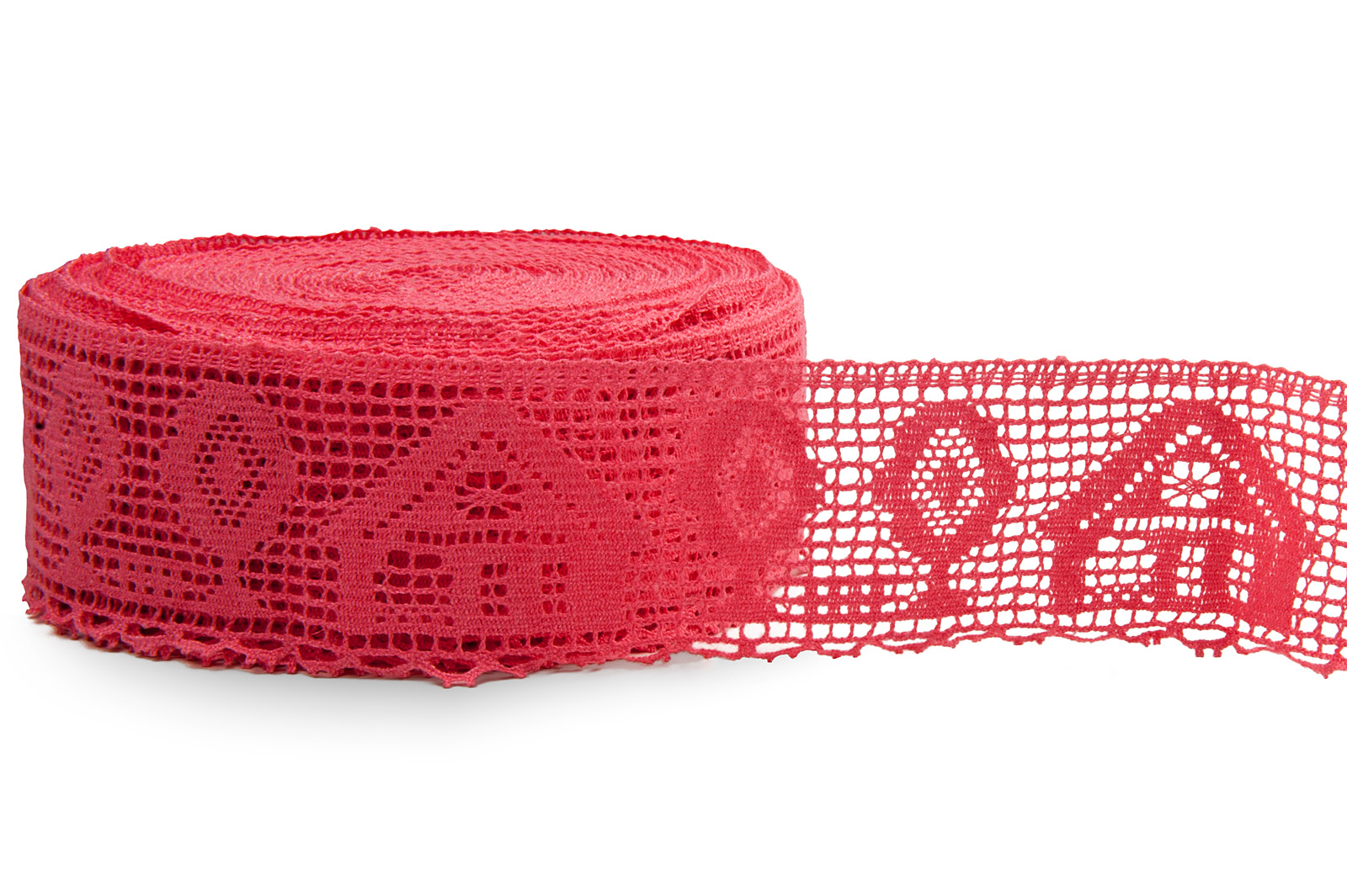 Jaskrawa różowa lniana koronka wytkana w sympatyczny wzorek: domki i drzewka. Koronka do dekoracji romantycznych firaneczek – zazdrostek, obrusów, pościeli i in.
