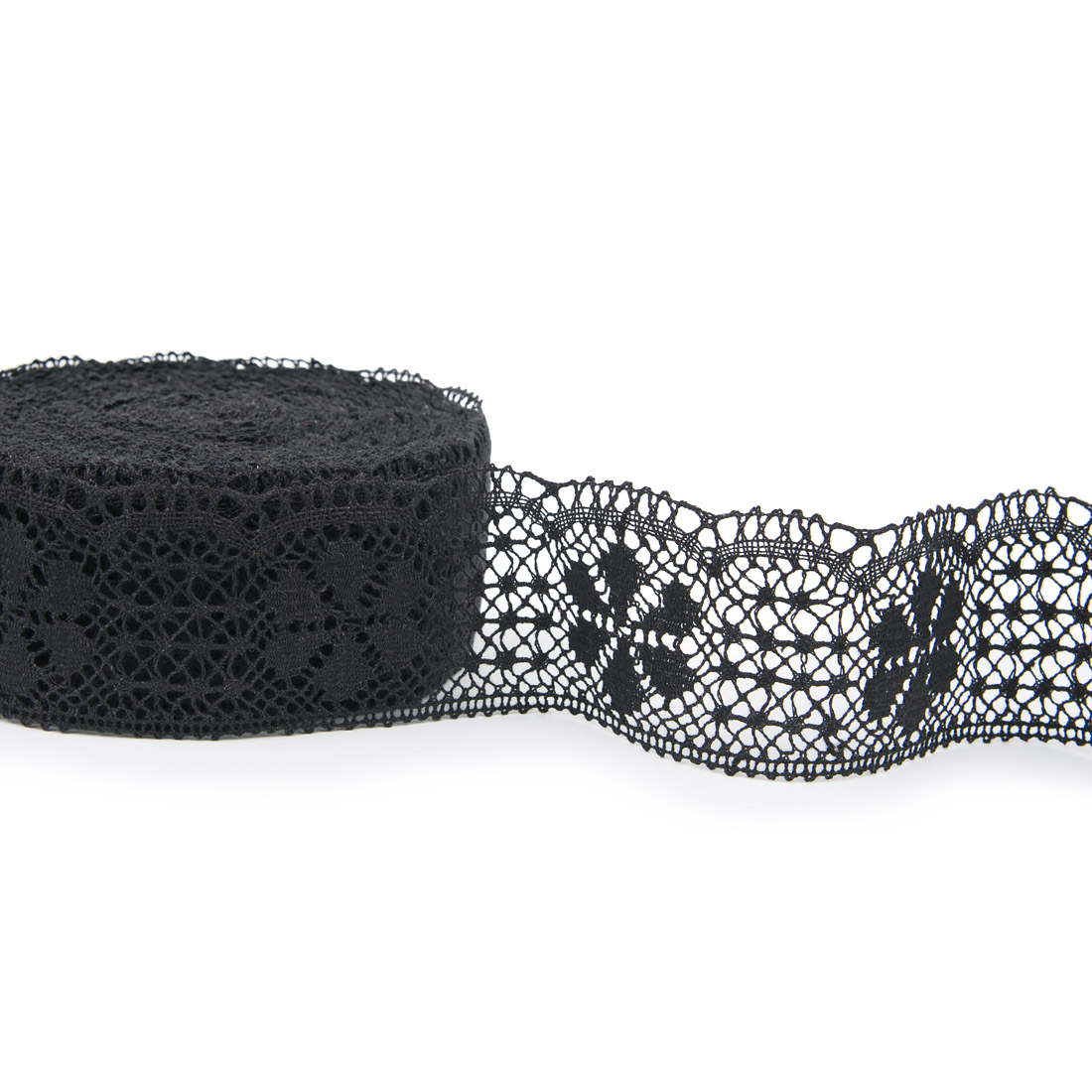 Czarna koronka lniana wytkana we wzór kwiatów. Szeroka 6 cm. Jeżeli jesteś zwolennikiem ciemnych elementów ozdobnych – ta koronka pięknie ozdobi strój albo któryś z tekstyliów domowych.