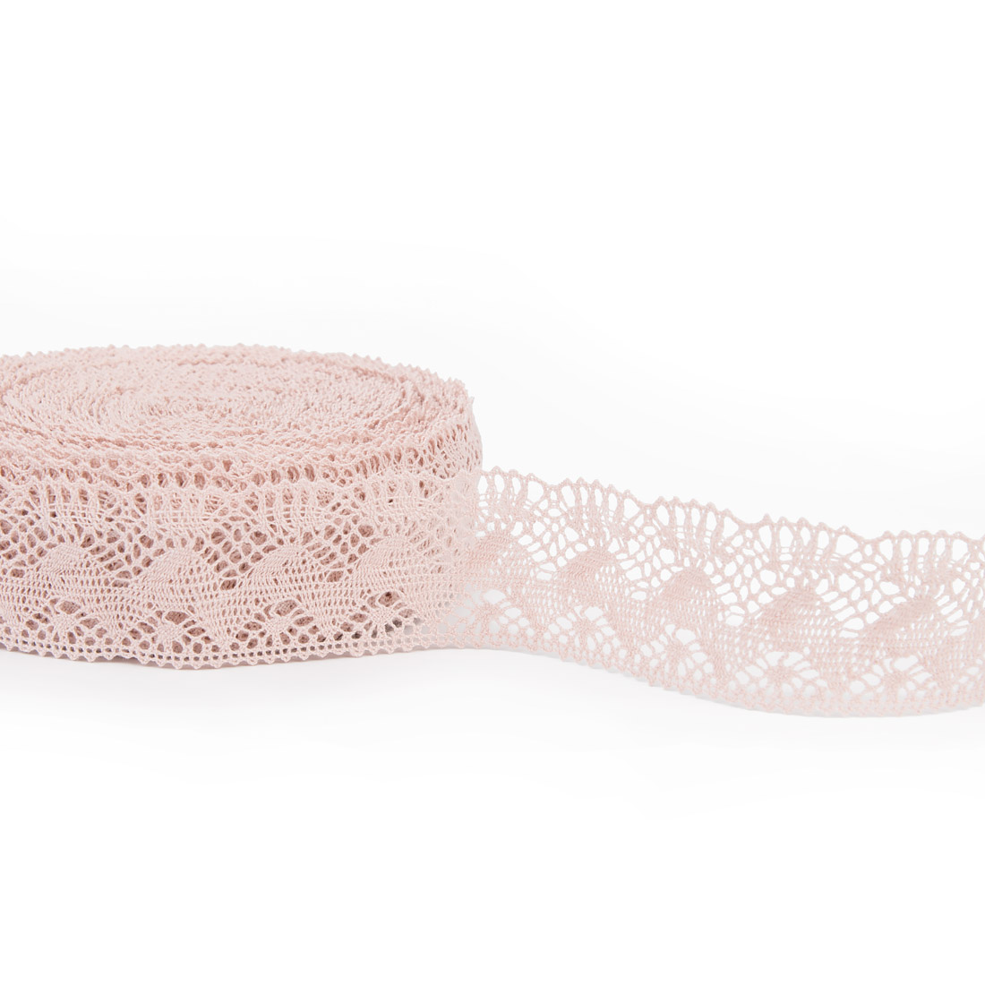 Koronka lniana w kolorze jasnego, pastelowego różu. Szerokość 4,5cm. Wytkana we wzór fali. Delikatna w kolorze koronka pięknie ozdobi np. pościel albo ubranka dziecięce.
