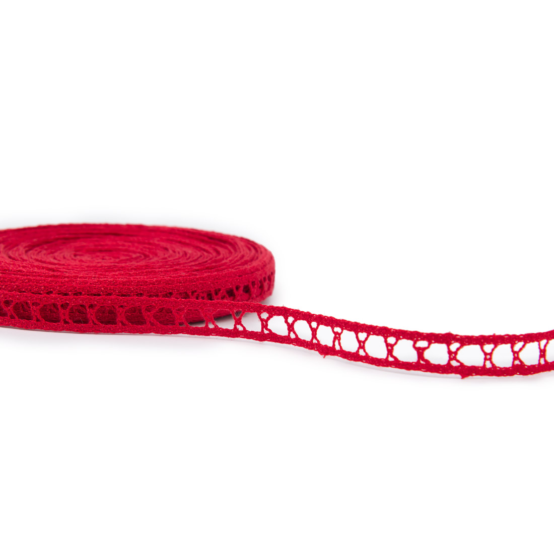 Intensywnie czerwona koronka lniana wytkana w dość duże okienka. Wąska - 1,2cm. Kolorowy akcent ożywi dowolny produkt.