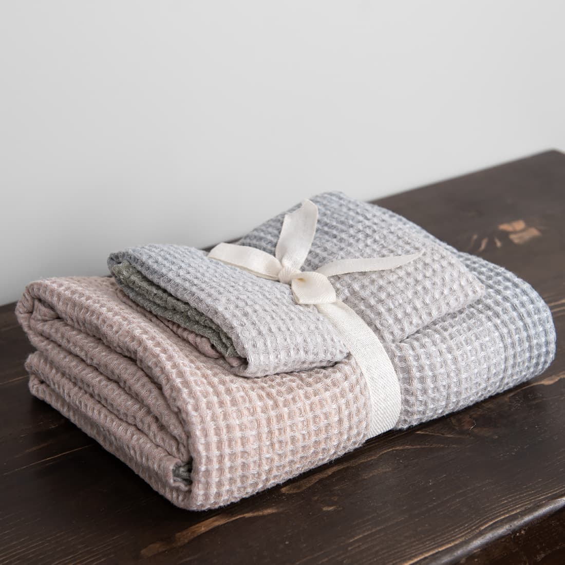 - Szczegóły: pętelka – zawieszka. Komplet dwóch ręczników jest przewiązany szeroką wstążeczką