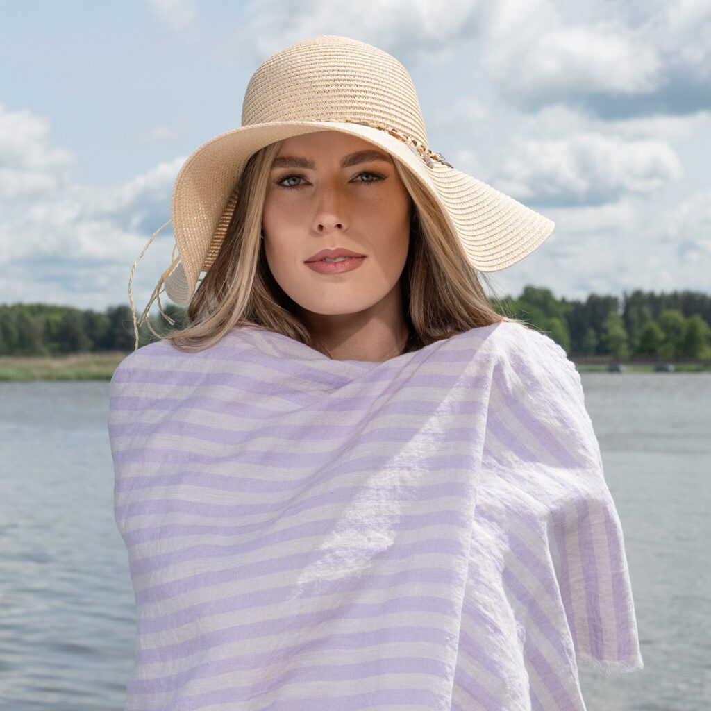 - Kolor: wytkany z jasnoliliowej i waniliowej przędzy