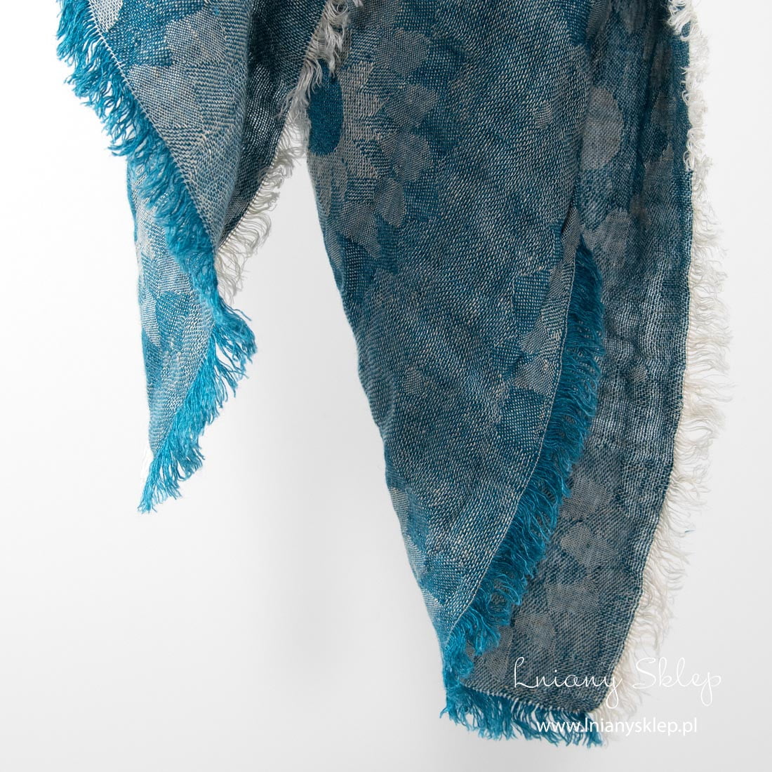 Turkusowa lniana chusta w kwiaty wytkana żakardowo z przędzy turkusowej (niebieskiej o lekkim zielonym odcieniu) i piaskowej. Chusta z pranej tkaniny lnianej jest mięciutka i przytulna, ma lekko gniecioną fakturę. Można nią się otulić wieczorem albo przykryć dziecko w wózeczku – lniana chusta jest produktem uniwersalnym.