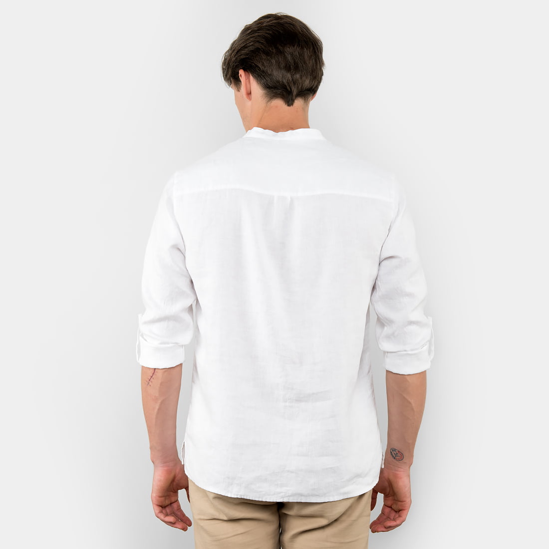 Lniana koszula męska biała ze stójką. W kolekcji mamy koszulki tego modelu w kilku kolorach. Dopasuj śnieżnobiałą koszulkę do dżinsów, spodni albo szortów.
