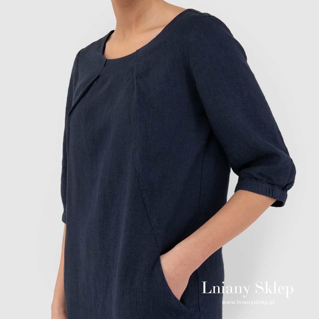 Granatowa sukienka z pranej tkaniny 100% lnianej. Ciemna, elegancka sukienka lniana na wyjście do pracy i na bardziej uroczysty wieczór. Dostępne rozmiary 36- 50.