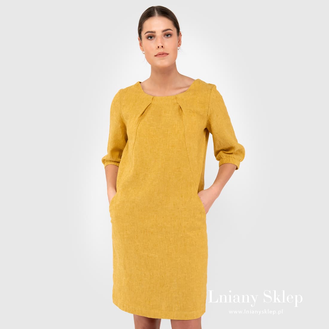 Żółta sukienka z pranej tkaniny 100% lnianej wytkanej melanżowo z jasnożółtej i musztardowej przędzy. Słonecznie żółta, lekka lniana sukienka na co dzień i na większe wyjście. Dostępne rozmiary 36- 50.
