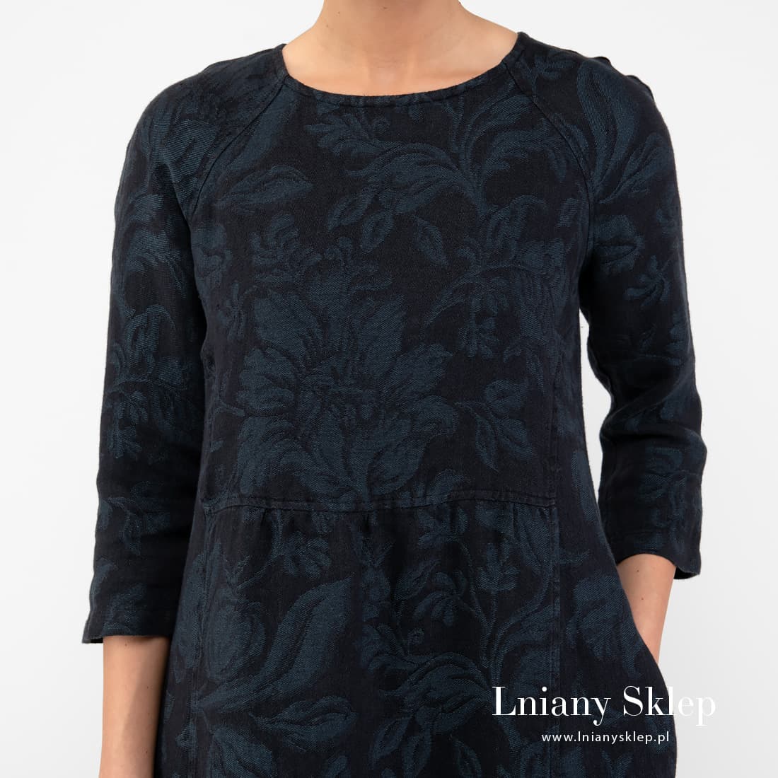 Czarna sukienka w kwiaty. Czarne tło tkaniny żakardowej wytkane zostało we wzór pięknych, granatowych, barokowych kwiatów. Ciemna sukienka z pranego lnu. Zabłyśnij, wyróżnij się z tłumu!