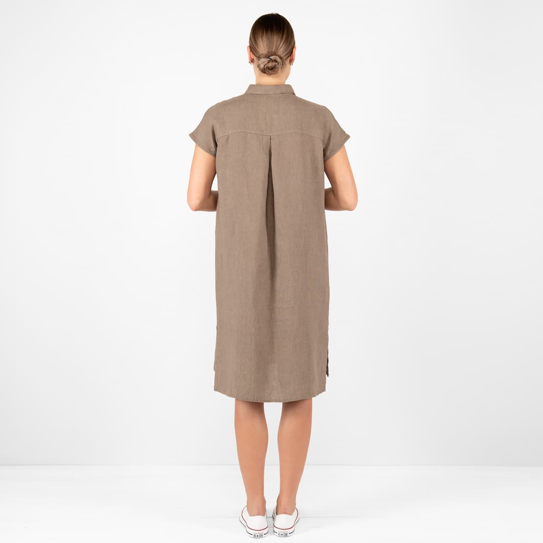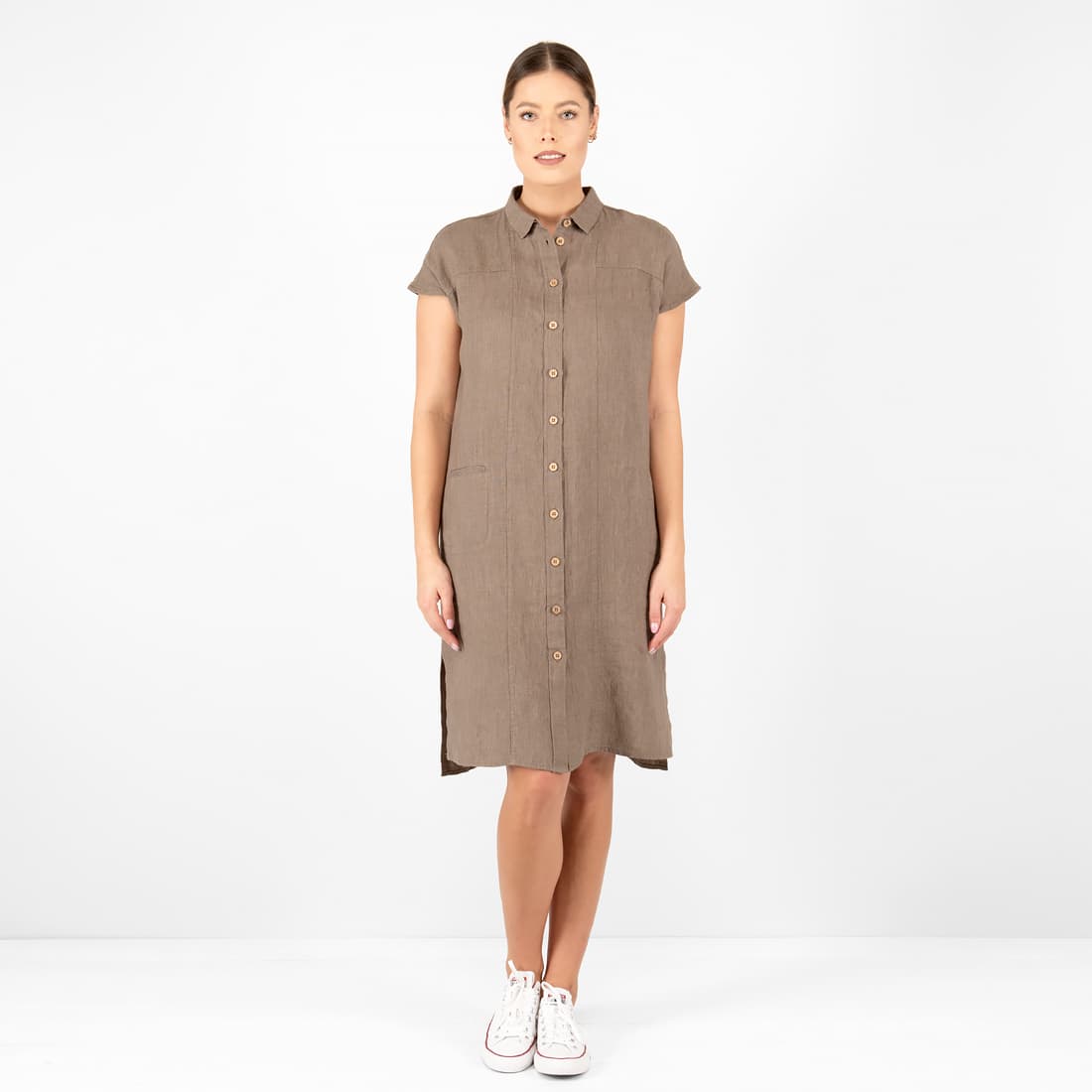 - Szczegóły: krótki rękaw; zapinana na guziki; kieszeń z prawa; tył sukienki nieco dłuższy; rozporki na bokach