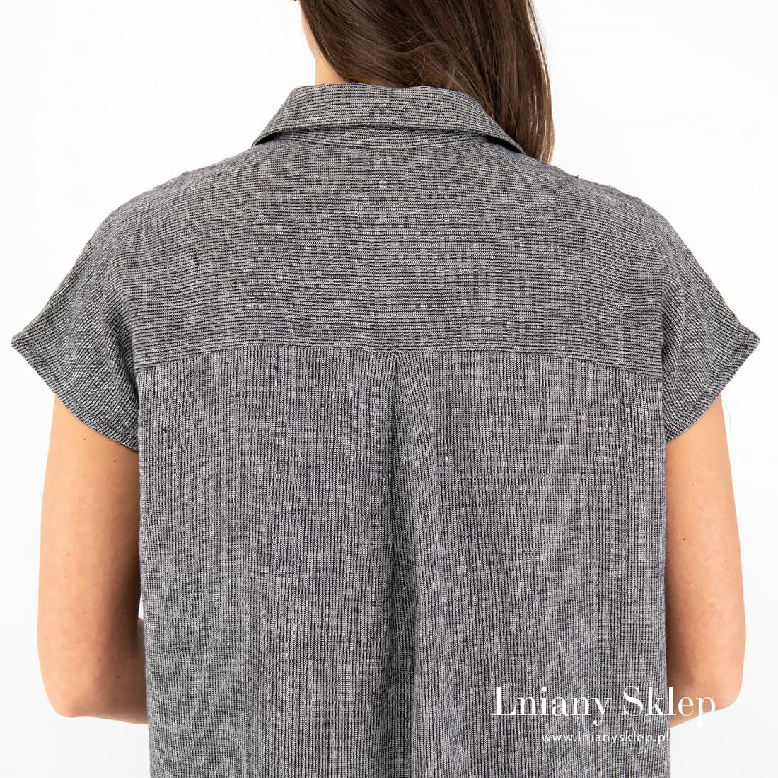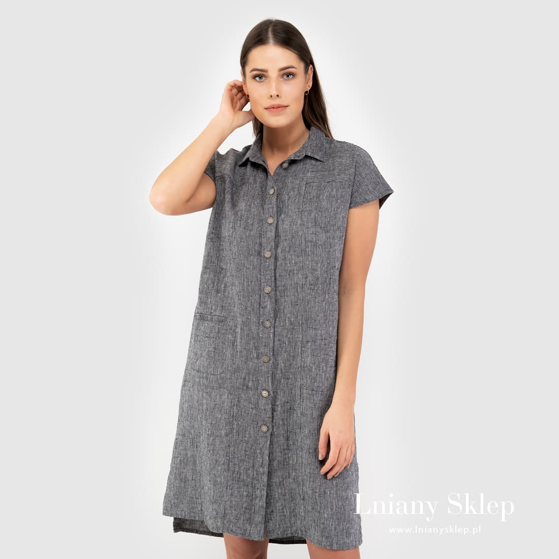 Czarna sukienka z pranej tkaniny 100% lnianej wytkanej w drobniutkie pionowe paski z przędzy czarnej, białej i niebarwionej (szarej o piaskowym odcieniu). Sukienka o luźnym kroju dostępna w rozmiarach 36 - 50.