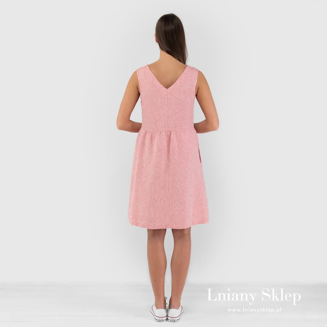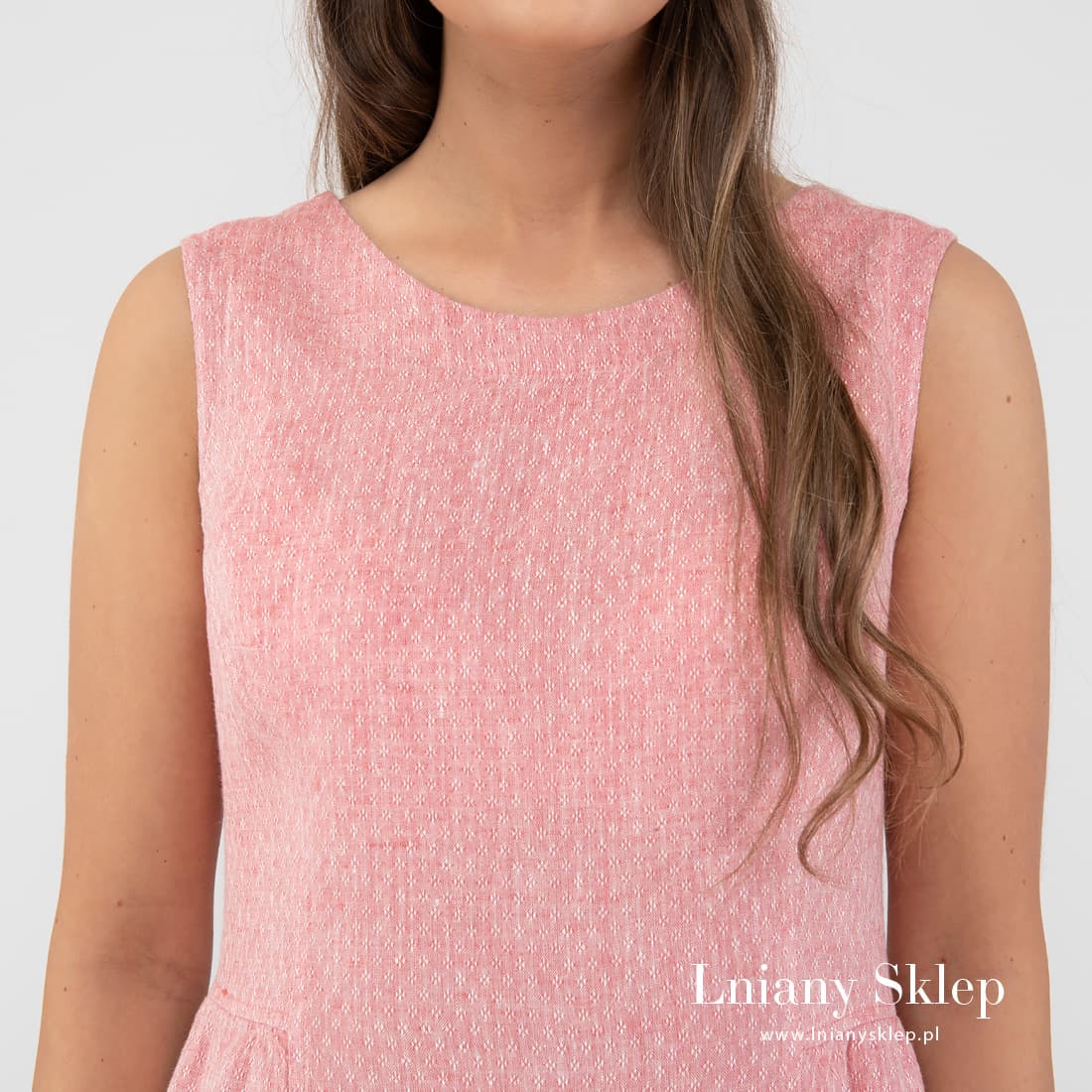 Różowa sukienka z tkaniny wytkanej w drobne romby z przędzy różowej i białej. Krótka sukienka bez rękawów, z dekoltem na plecach – wygodna, bardzo dziewczęca sukienka z pranego, przewiewnego lnu na upalne lato!
