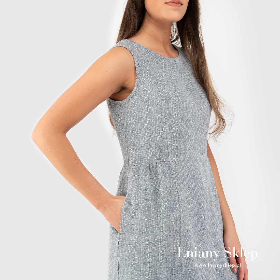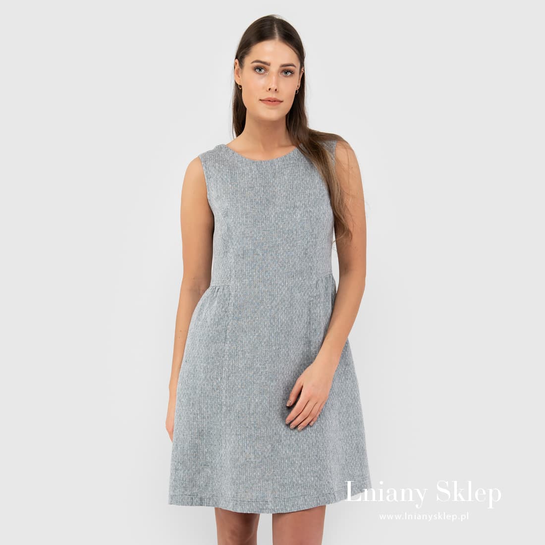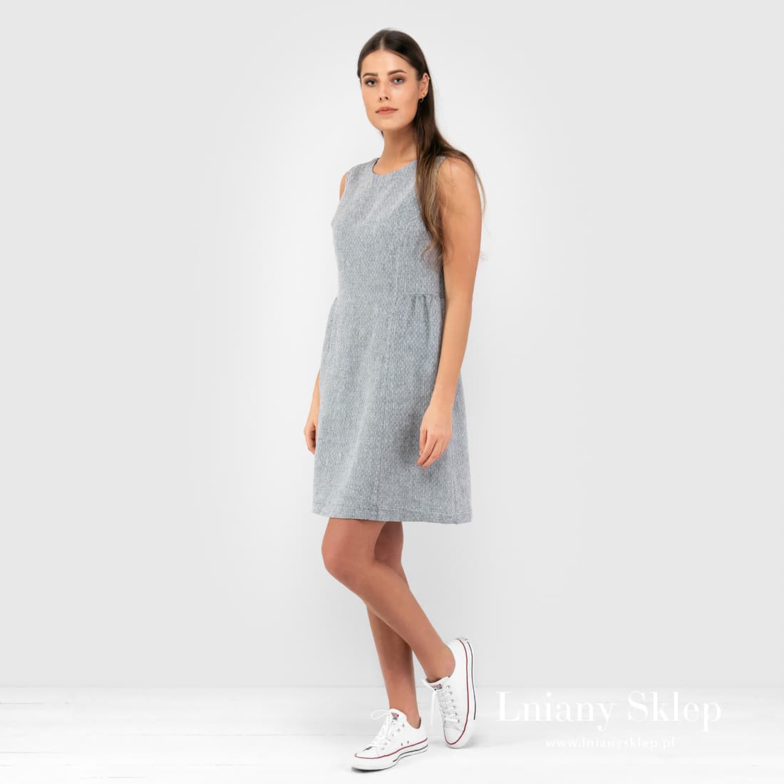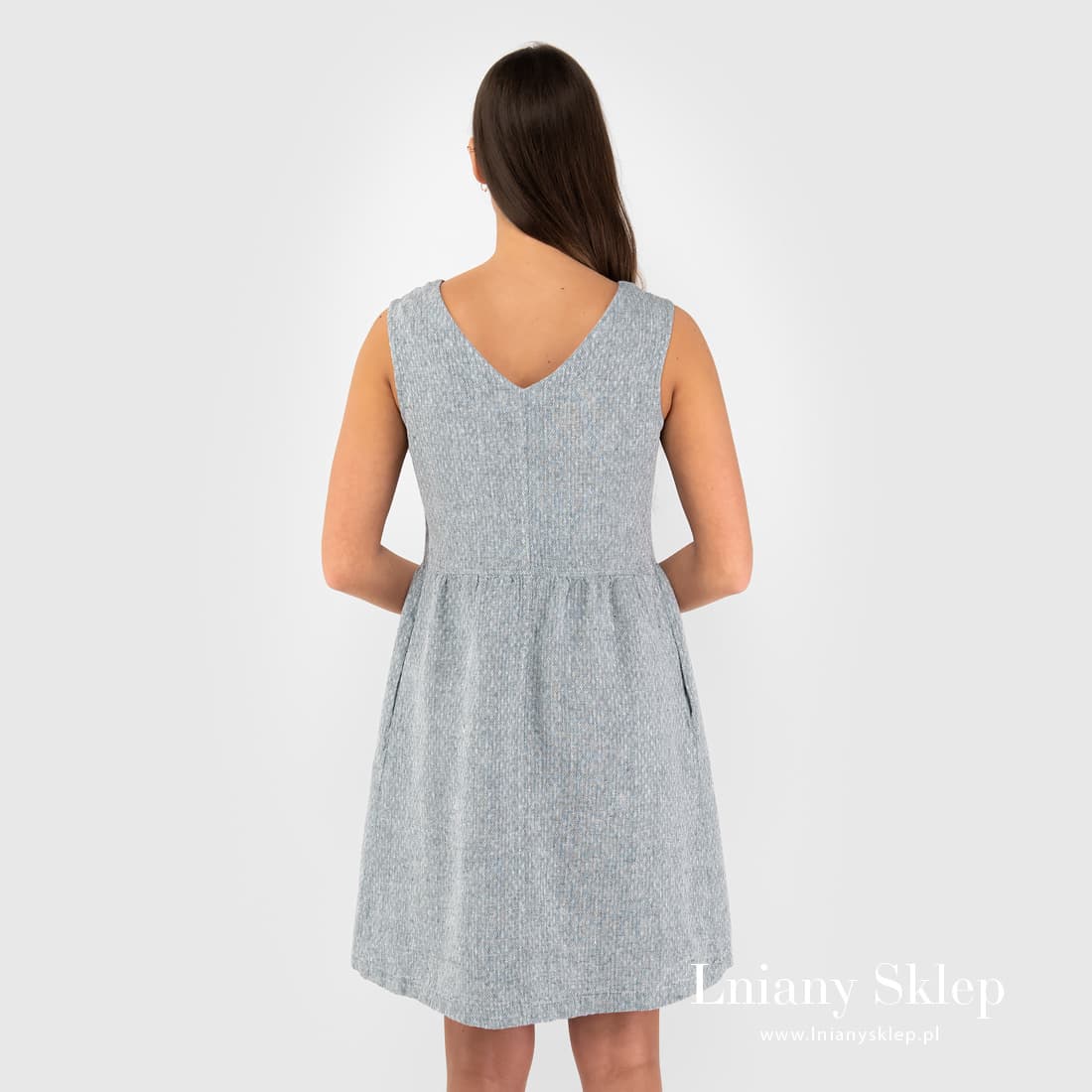 Szara sukienka z tkaniny wytkanej w drobne romby z przędzy szarej o niebieskim odcieniu i białej. Krótka sukienka bez rękawów, z głębokim dekoltem na plecach – dziewczęca sukienka z pranego, przewiewnego lnu. Wyglądaj pięknie, czuj się komfortowo!