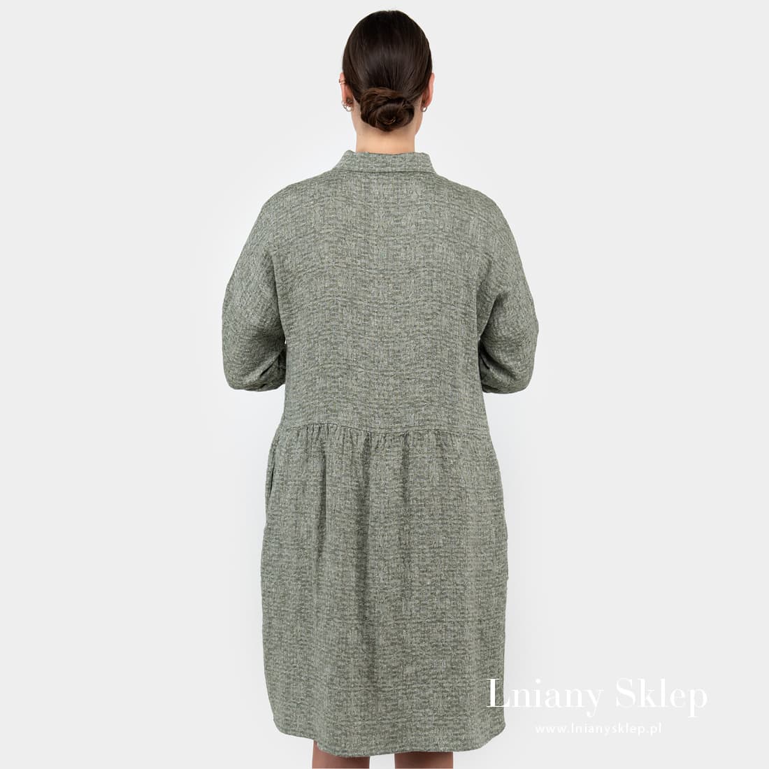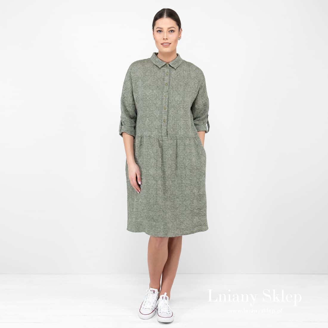 - Model: luźny krój. Jeżeli wolisz ciaśniej dopasowane sukienki, rozważ wybór sukienki o jeden rozmiar mniejszej.