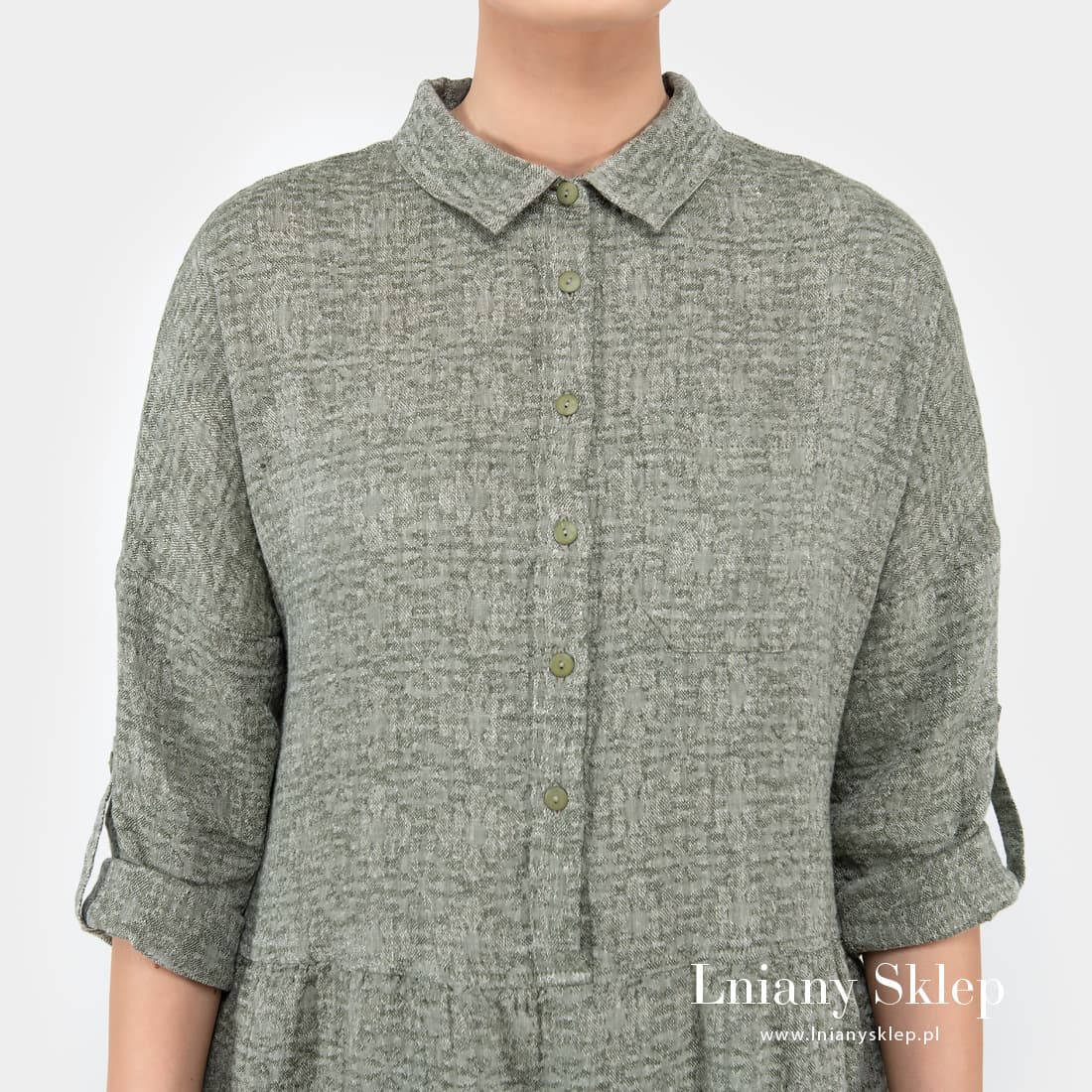 - Szczegóły: zapinana na guziki do linii talii; kieszeń z przodu na piersi z lewa; podwijany rękaw ¾; lekko marszczona na linii talii; kieszenie w bocznych szwach