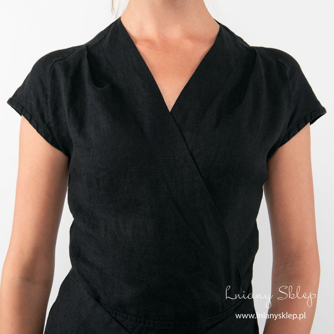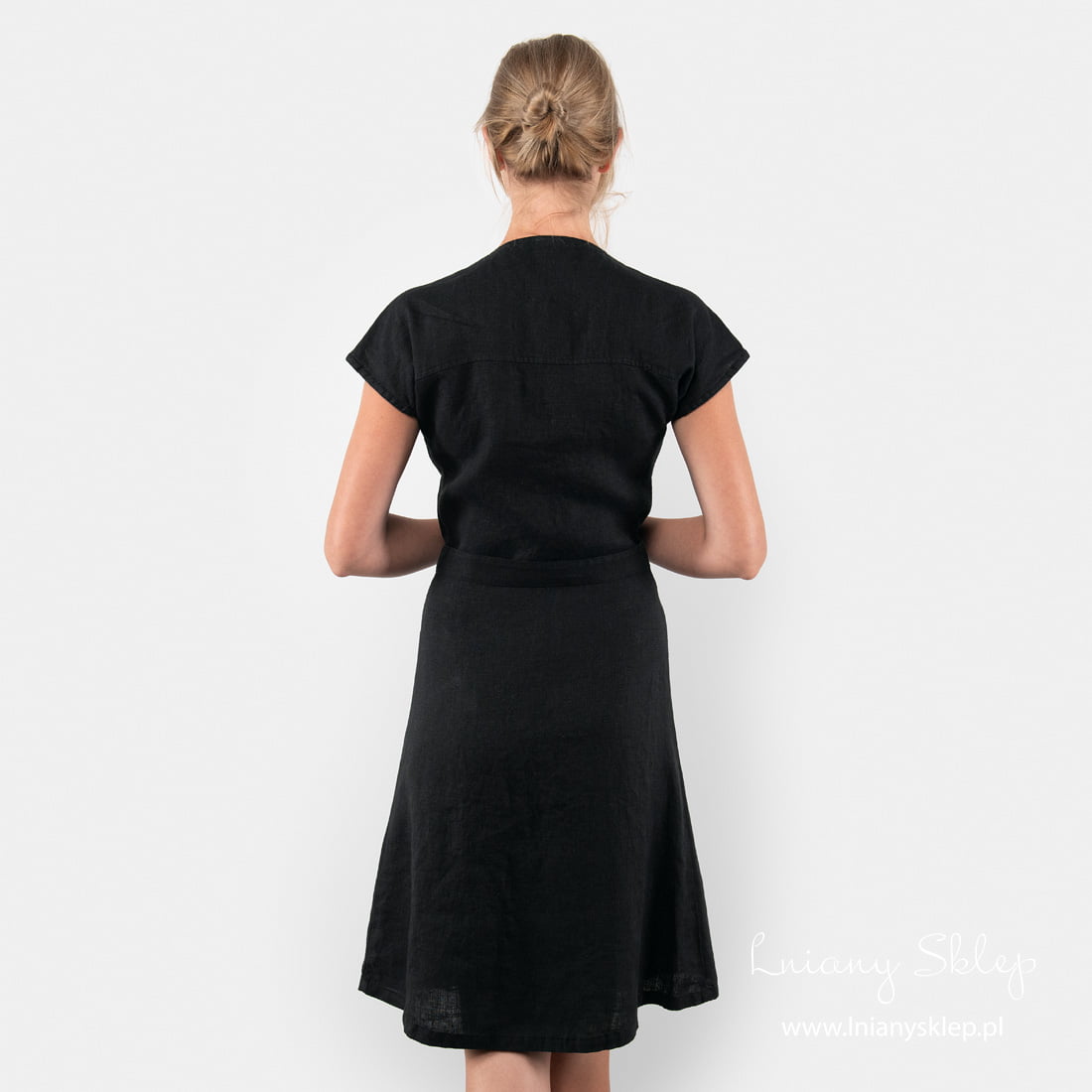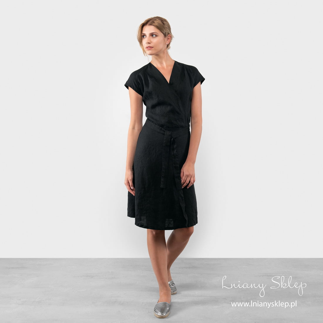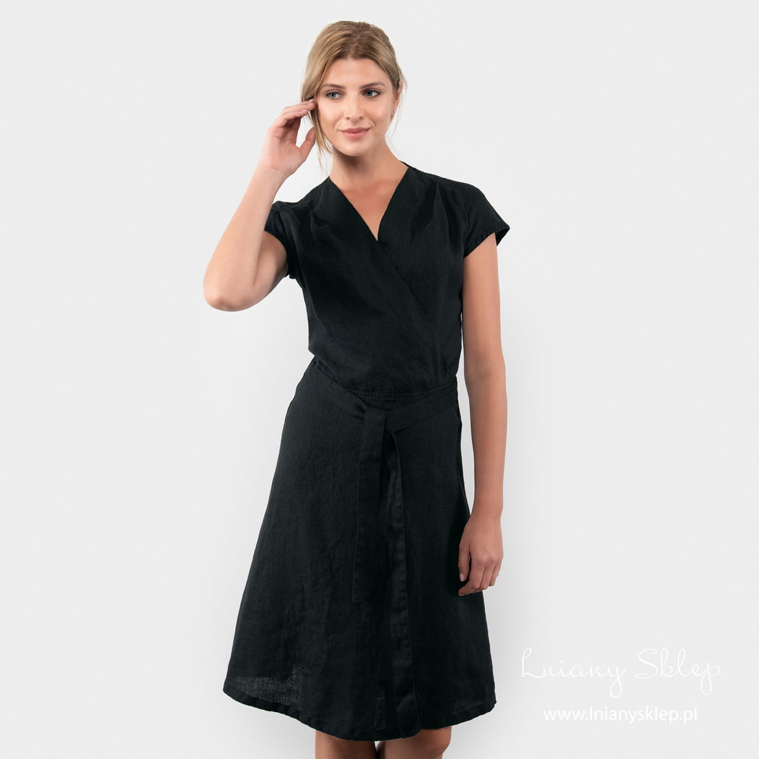 Lniana czarna sukienka – odpowiedni strój na lato. Lekka sukienka z pranego lnu przypomina krój szyty „na zakładkę”, jednak spódnica jest cała, nie podniesie ją wiatr. Len w dowolnym kolorze dobrze się sprawdza latem.