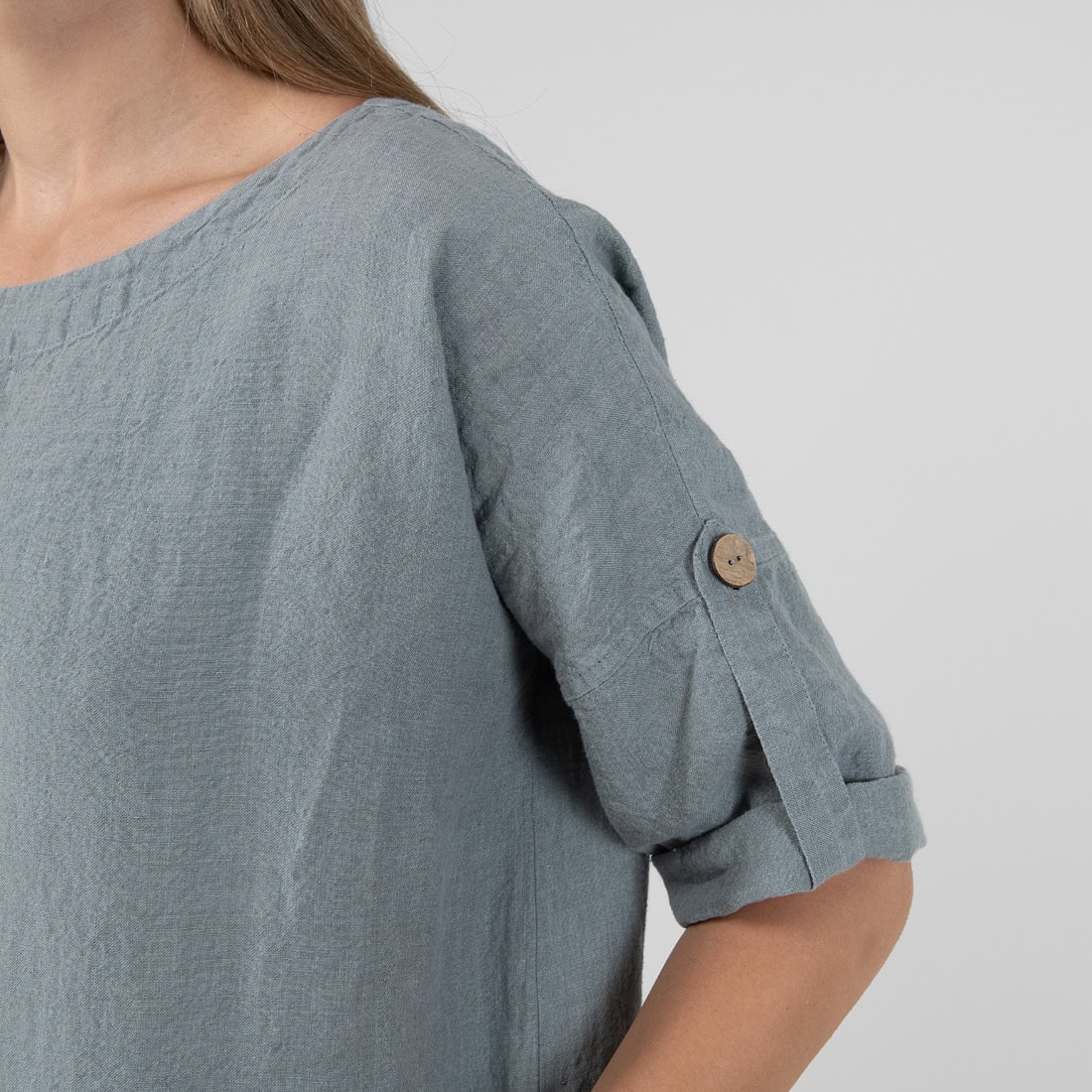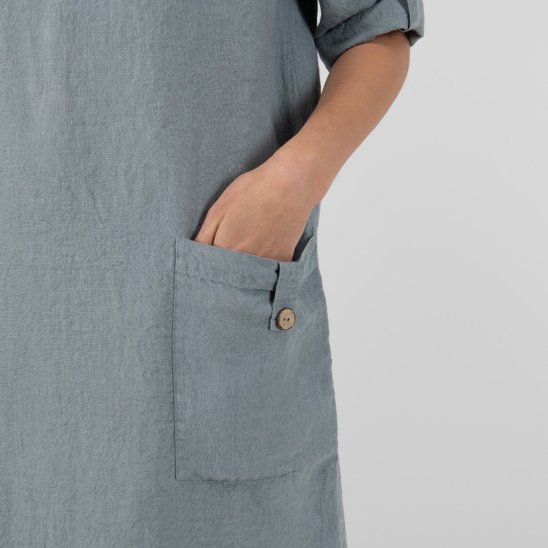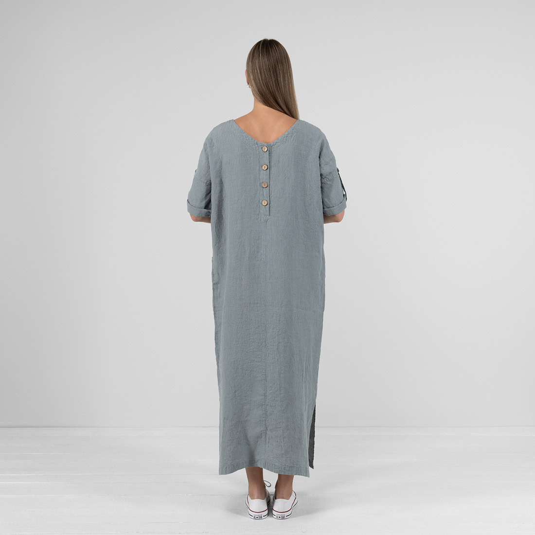 Długa, luźna sukienka z szarej o niebieskim odcieniu tkaniny 100% lnianej. To idealna suknia na spędzenie wakacji w upalnym klimacie, ponieważ len jest tą tkaniną, która lekko chłodzi i pozwala czuć maksymalny komfort w czasie największych nawet upałów. Ubierz się wygodnie i ruszaj na zwiedzanie cudów świata!