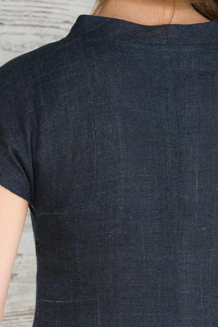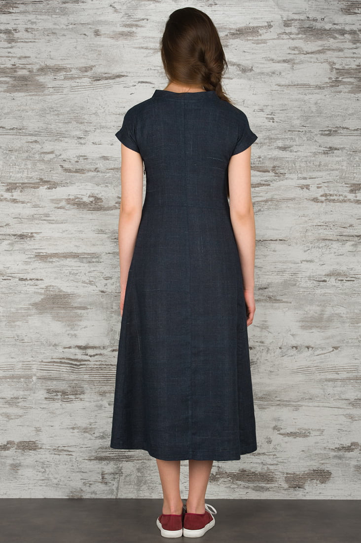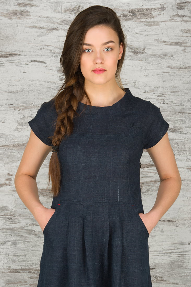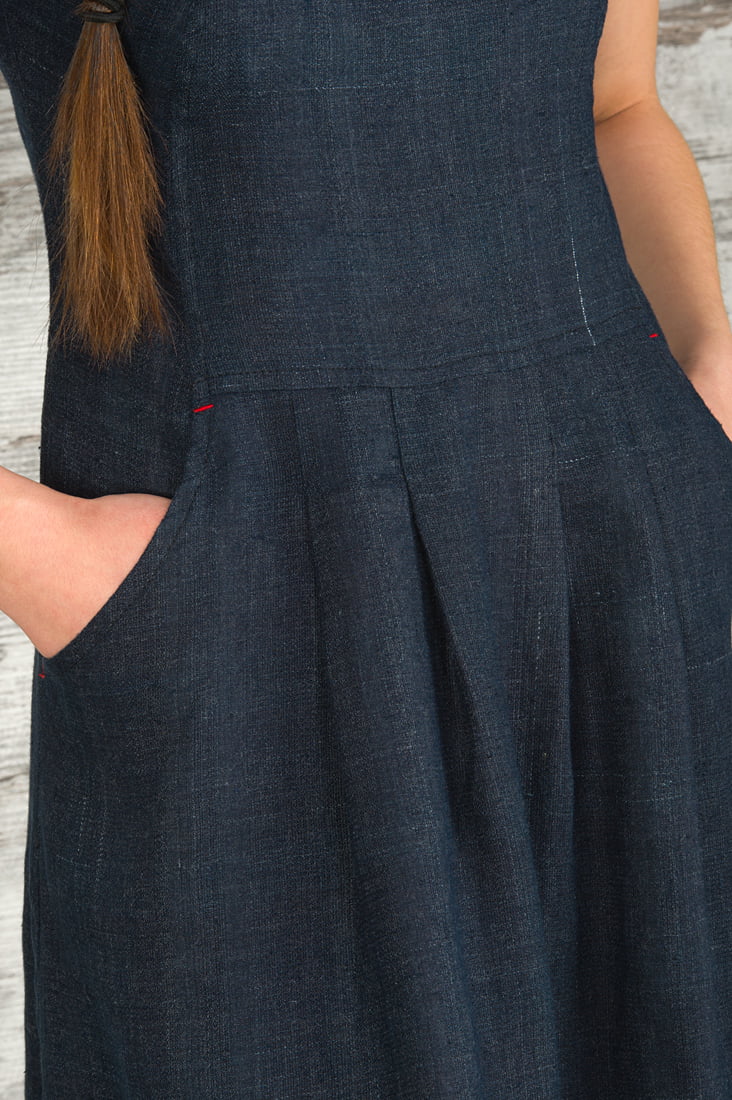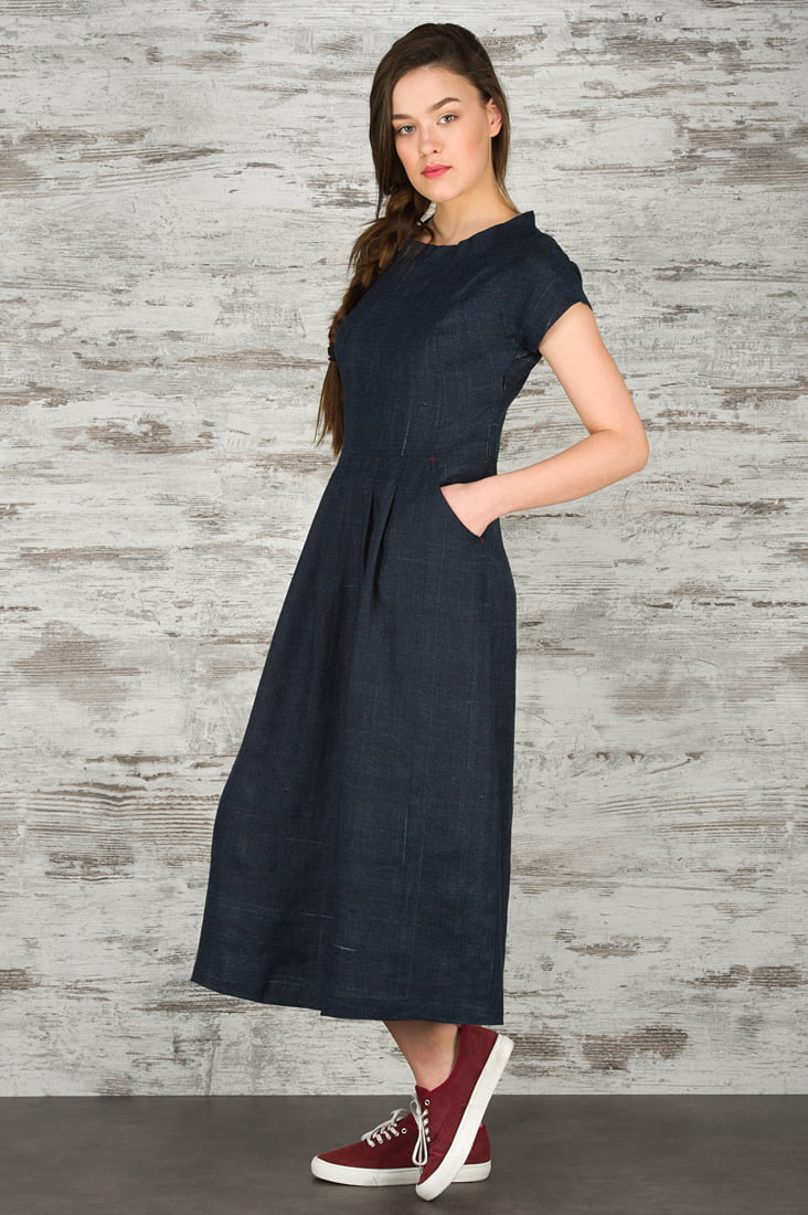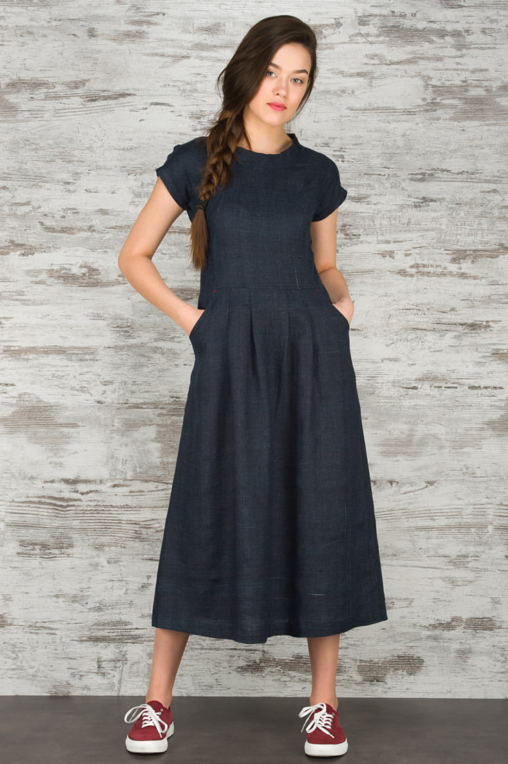Lniana sukienka na lato uszyta z tkaniny granatowej w jaśniejsze prążki. Dopasuj do sukni wygodne sportowe buty albo lekkie czółenka – ciesz się latem!!!
