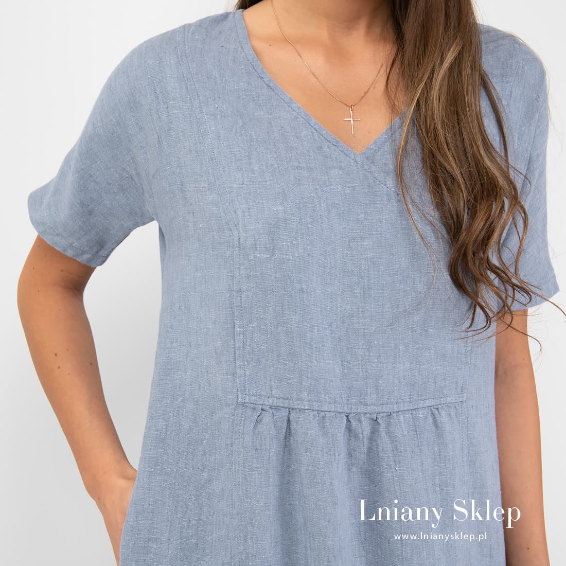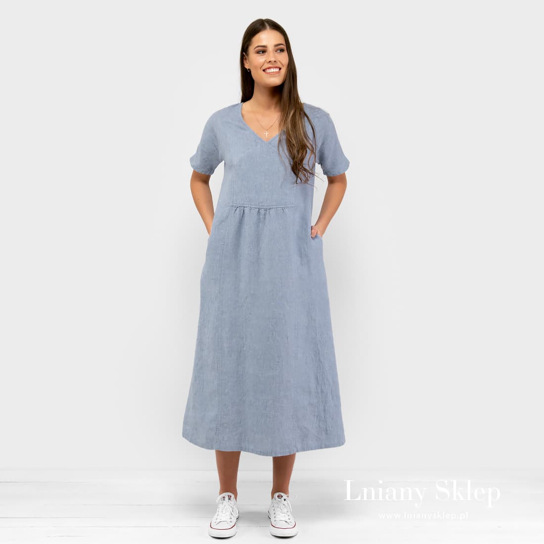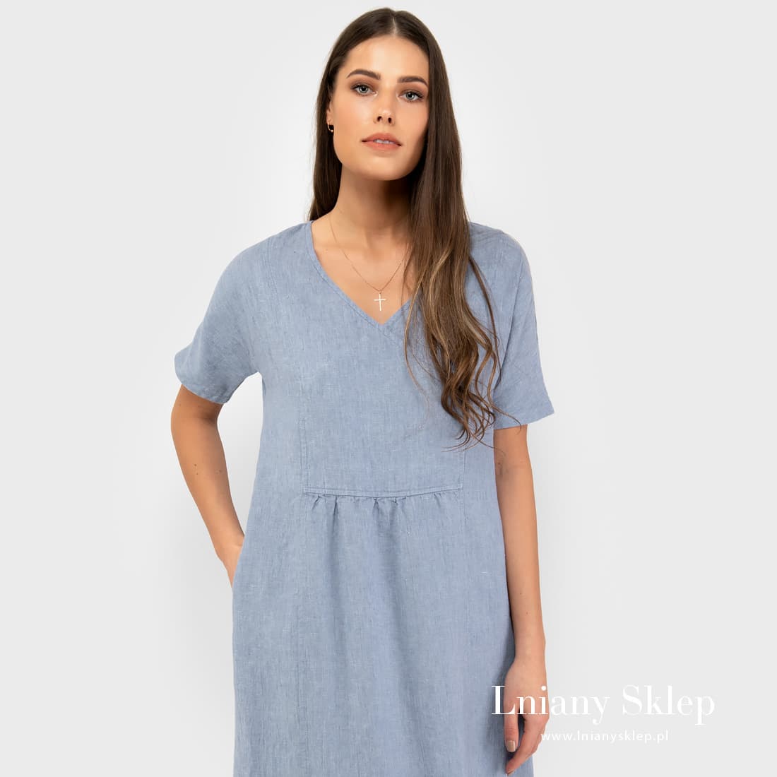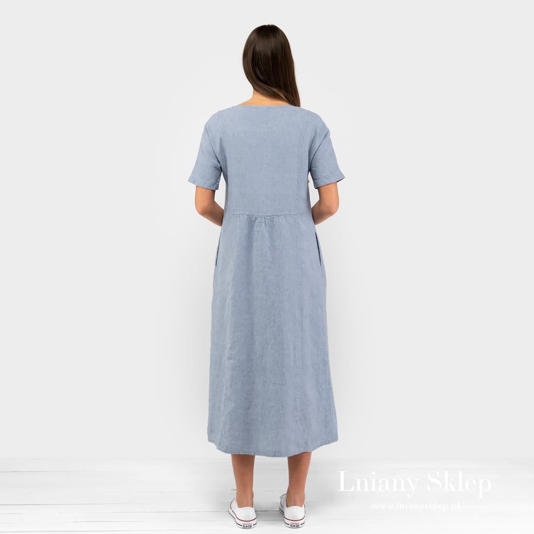 Niebieska sukienka z tkaniny wytkanej melanżowo z dwóch przędz o różnych odcieniach niebieskiego. Sukienka z pranego lnu w kolorze nieba na niezapomniane wakacje!