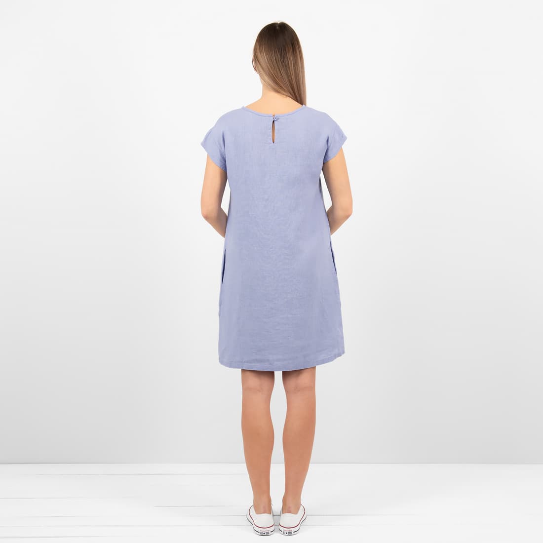 - Szczegóły: krótki rękaw; zaokrąglony dekolt, zaszewki z przodu, kieszenie, zapięcie na guziczek z tyłu