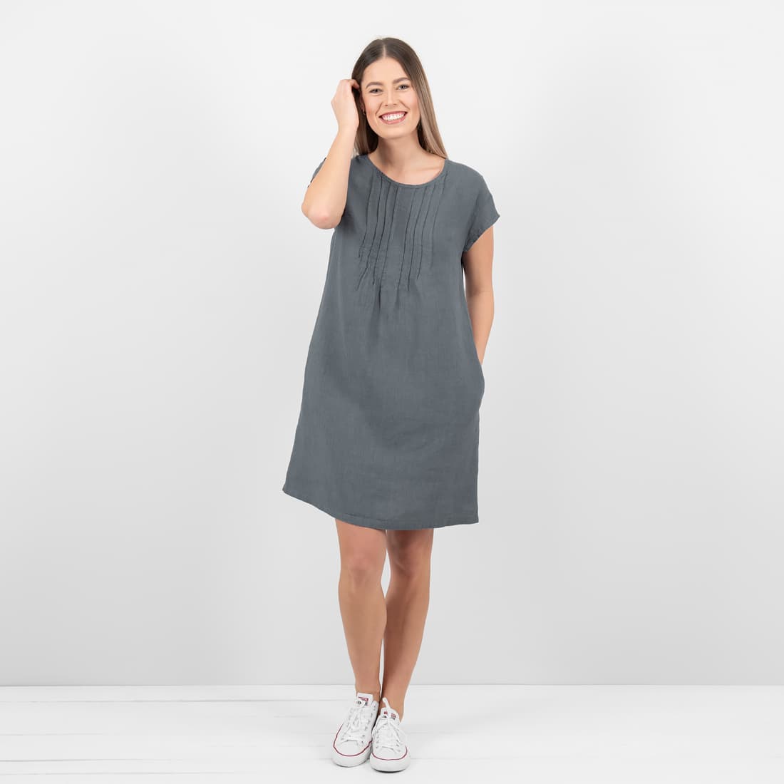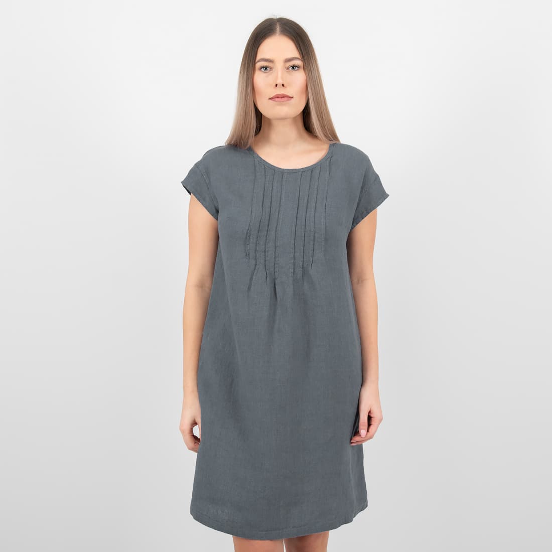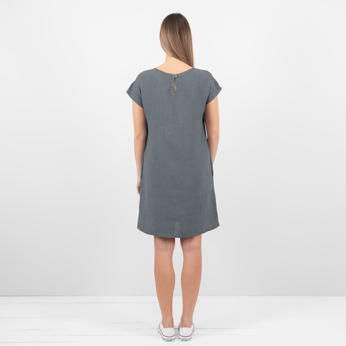 - Szczegóły: krótki rękaw; zaokrąglony dekolt, zaszewki z przodu, kieszenie, zapięcie na guziczek z tyłu