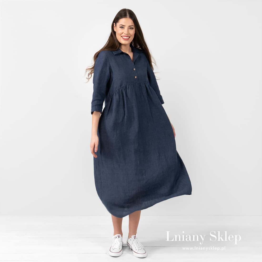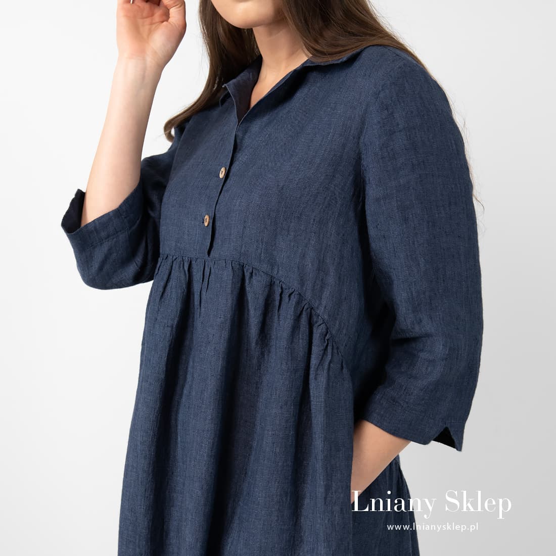 - Detale: z przodu zapięcie na guziki, rękaw długi 3/4, kieszenie, marszczona pod biustem