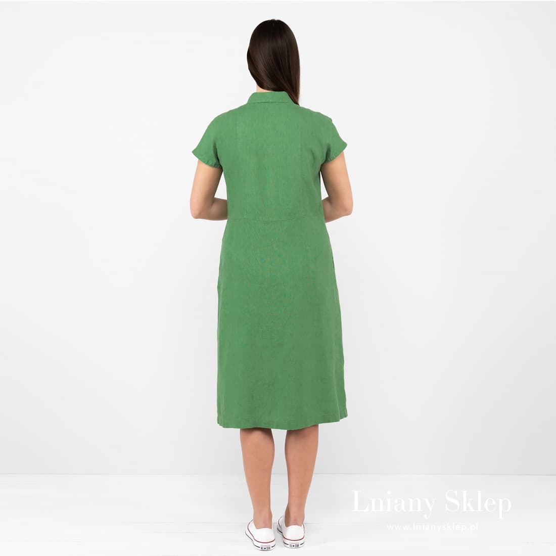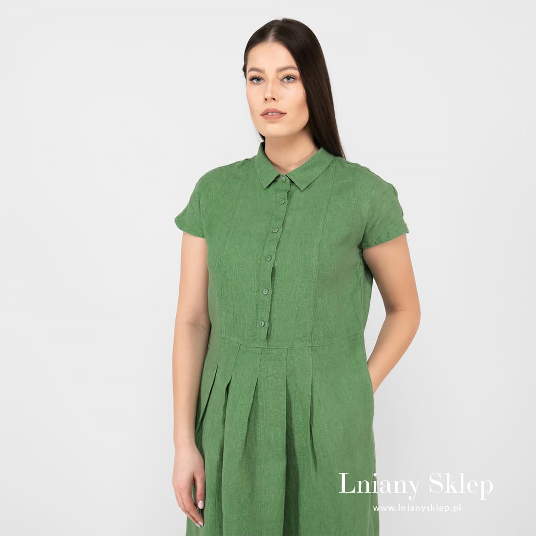 - Szczegóły: krótki rękaw; koszulowy kołnierzyk z przodu zakładki; zapięcie z przodu; kieszenie na bokach