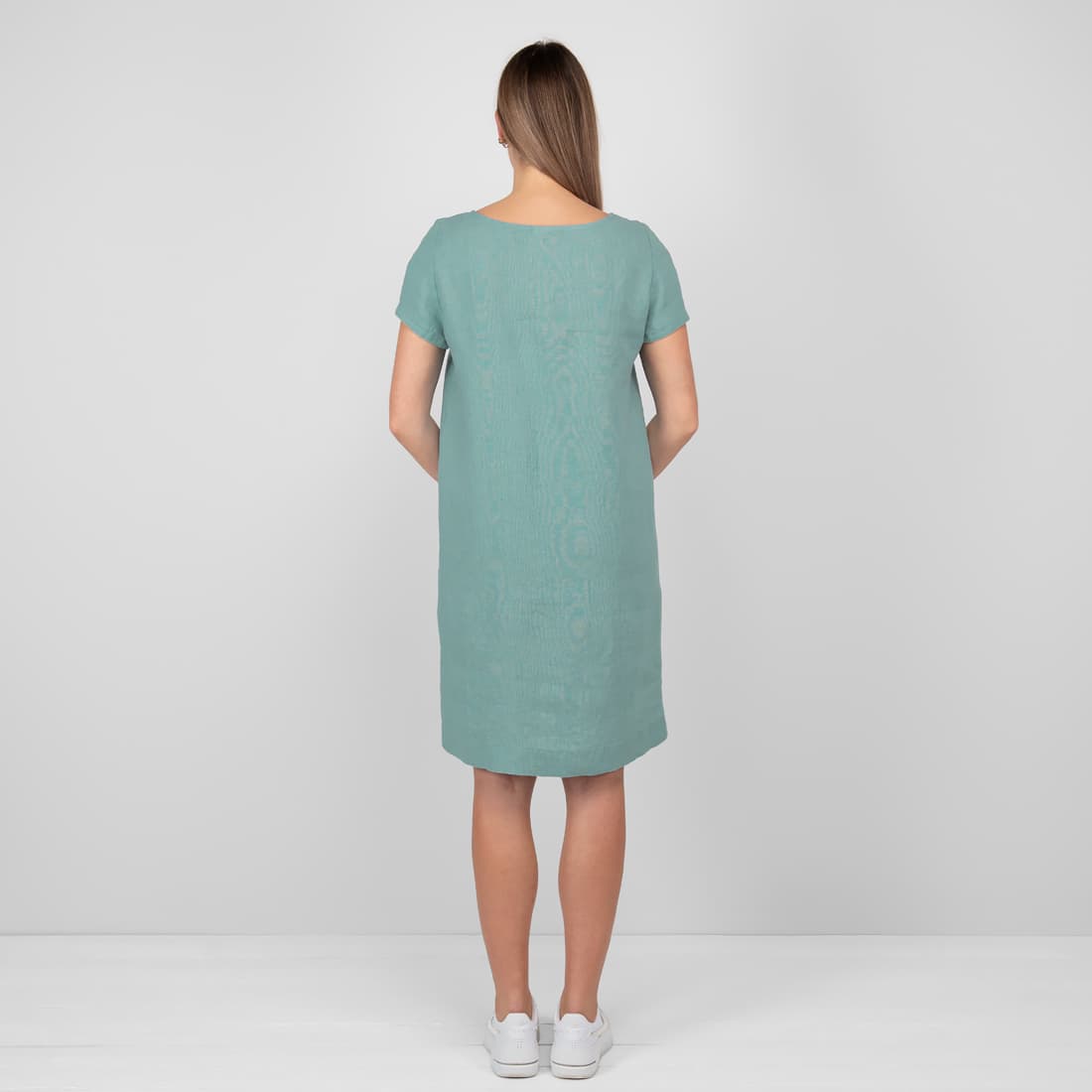 - Model: sukienka sięga kolan, równy krój