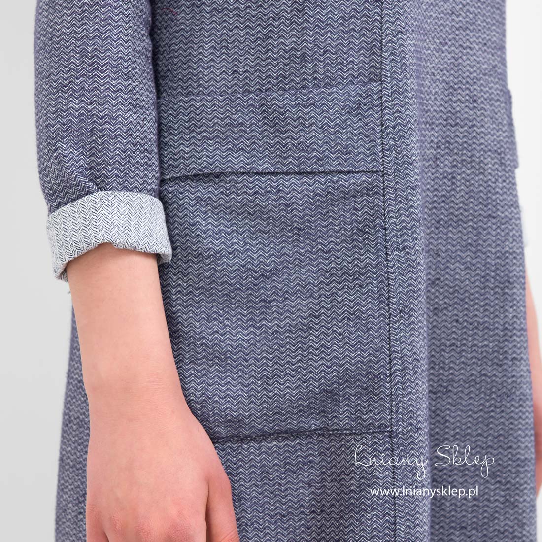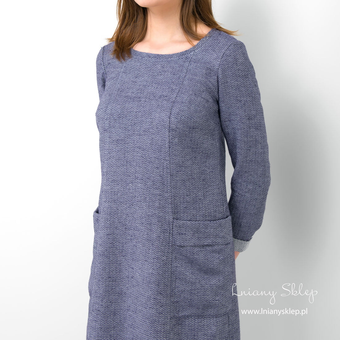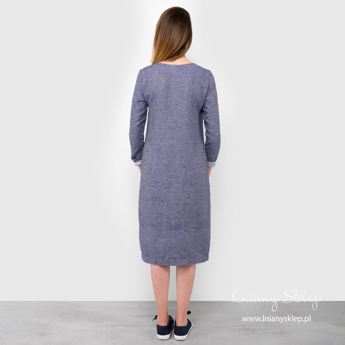 Sukienka granatowa, pstra, lniana z bawełną. Tkanina lniano – bawełniana została wytkana w drobny zygzaczek z przędzy granatowej i białej. Tkanina wcale nie prześwituje, jest dość gruba. Sukienka na chłodniejsze letnie wieczory albo na sezon wiosenno – jesienny, gdy włożyć len bardzo już się chce.