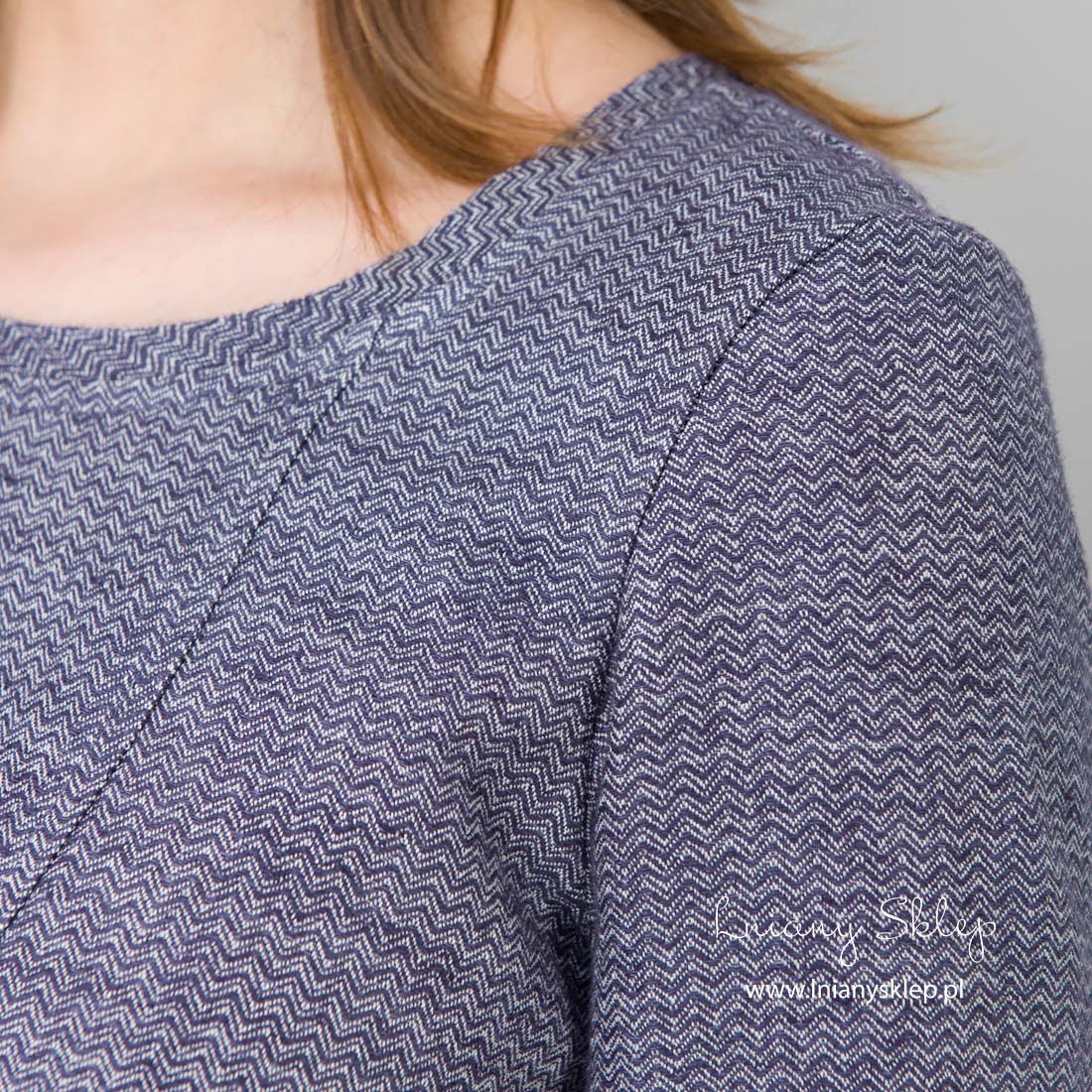 - Rękaw długi. Można nosić go podwinięty. Odwrotna strona tkaniny – biała w granatowy zygzaczek.