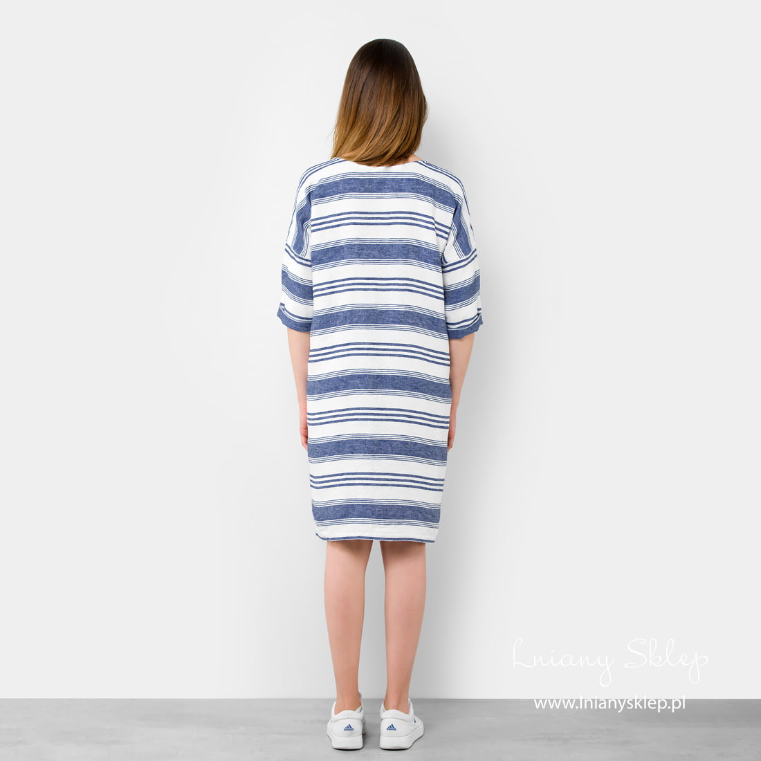 Sukienka lniana w niebieskie pasy na białym tle z tkaniny 100% lnianej wytkanej splotem skośnym. Sukienka o niewymyślnym kroju. Czaru niewątpliwie dodają jej pasy. Wskakuj w sukienkę i ruszaj nad morze!