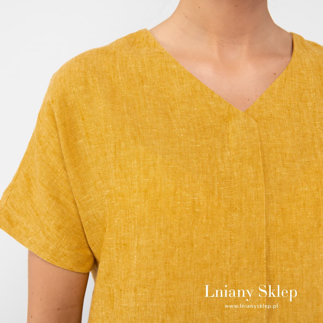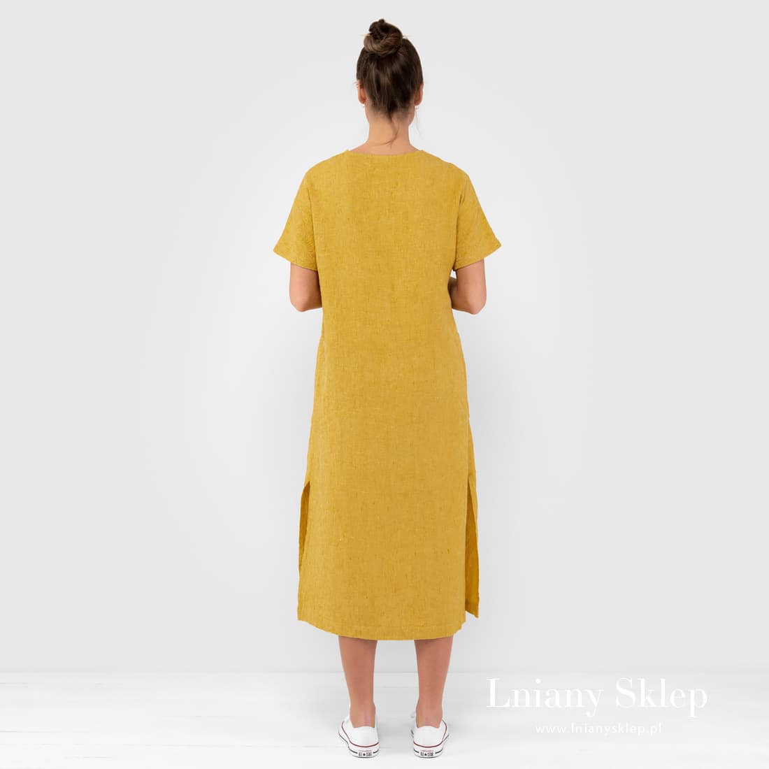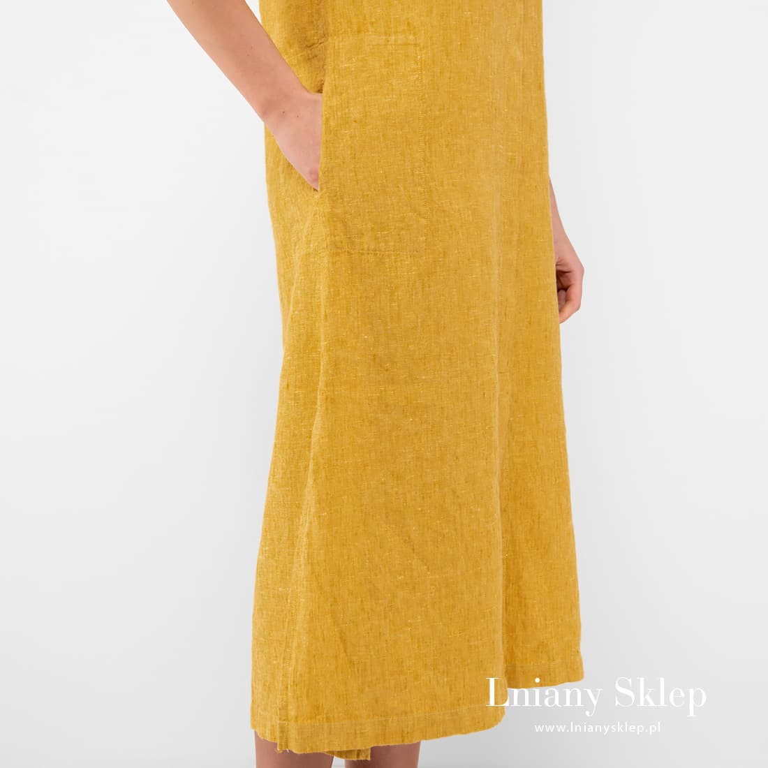 Żółta sukienka z tkaniny melanżowej wytkanej z przędzy 100% lnianej jasnożółtej i musztardowej. Słoneczny kolor, luźny krój, prany len – sukienka na świetny humor: jest lekka, nie krępuje ruchów, pozwala ciału swobodnie oddychać i nawet w pochmurny dzień nie zabraknie w niej słońca!