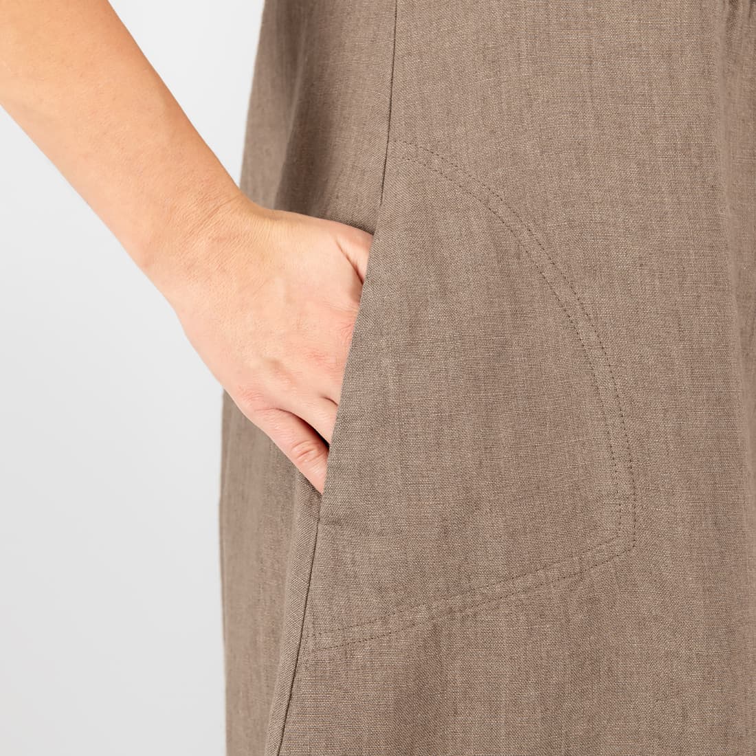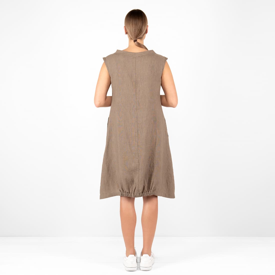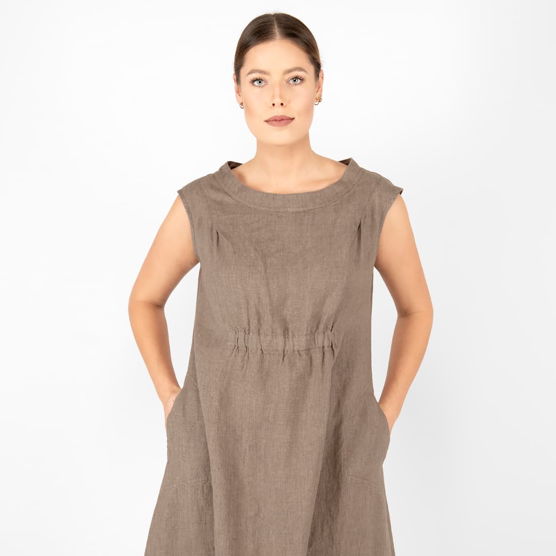 - Szczegóły: bez rękawów; zaokrąglony dekolt; namarszczana ponad talią i w dole; kieszenie