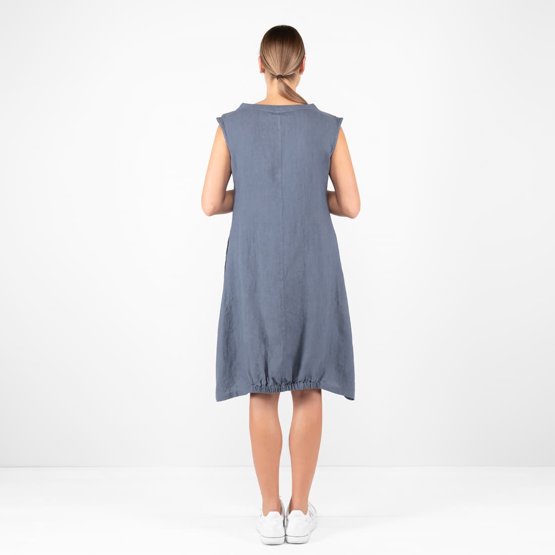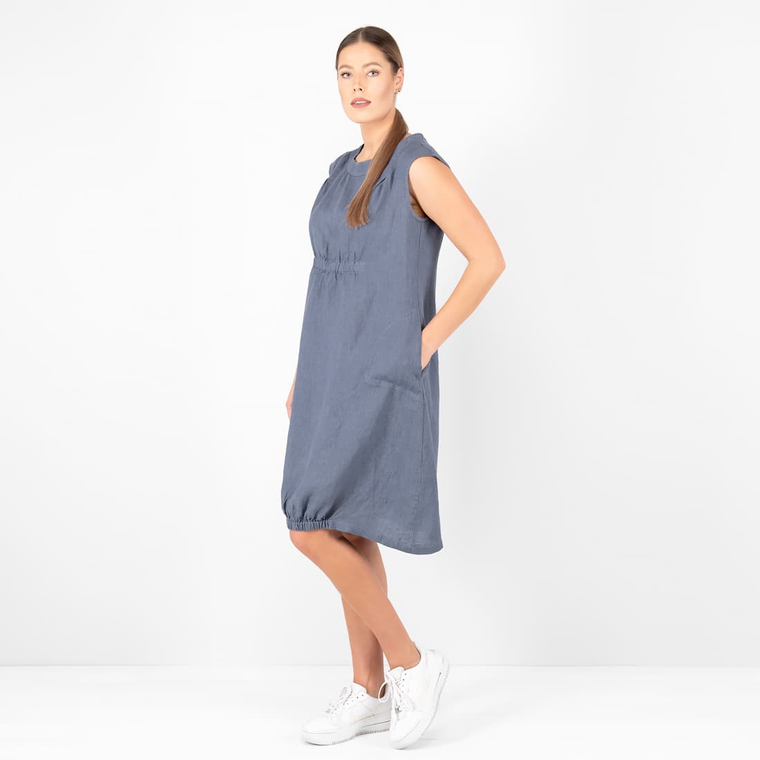 - Szczegóły: bez rękawów; zaokrąglony dekolt; namarszczana ponad talią i w dole; kieszenie