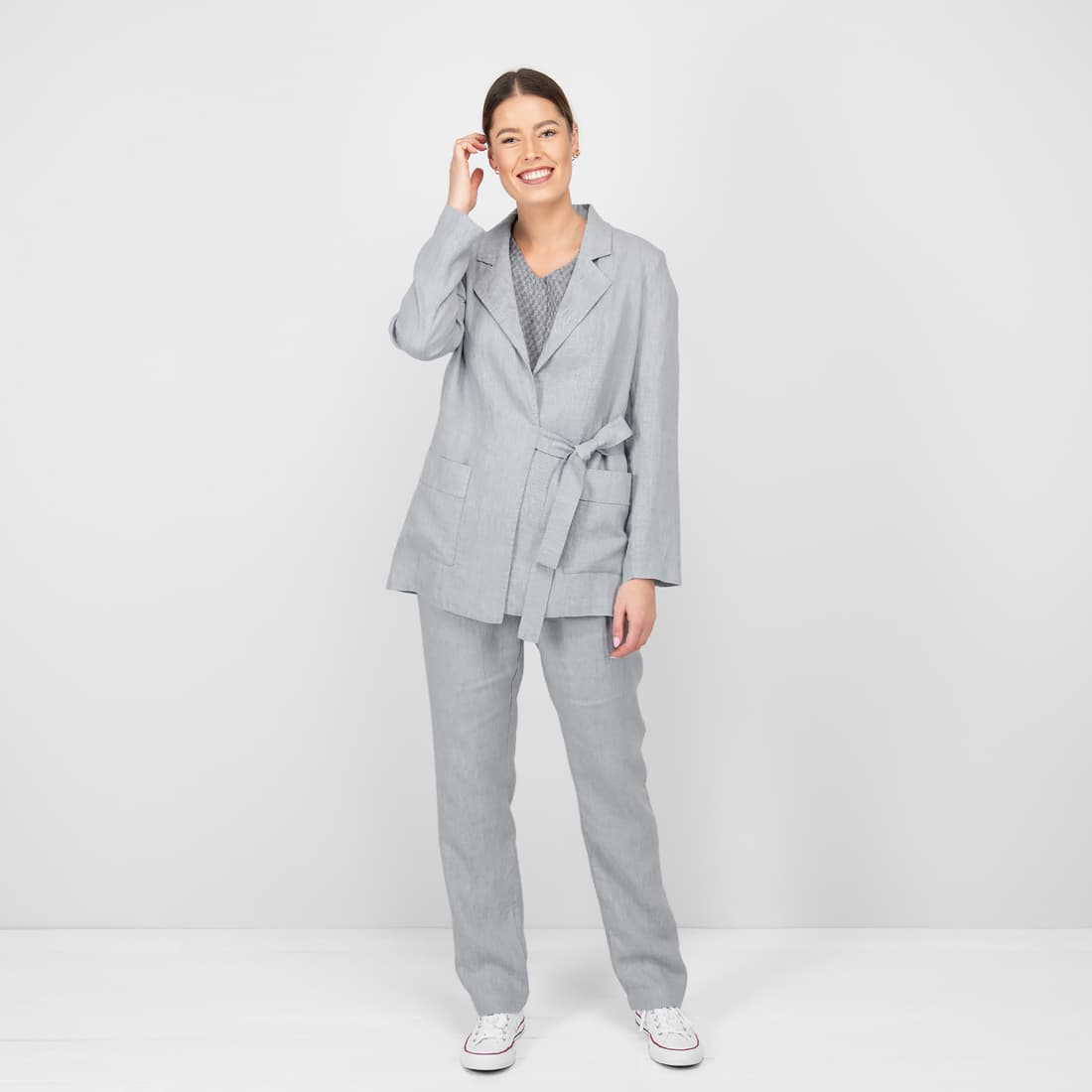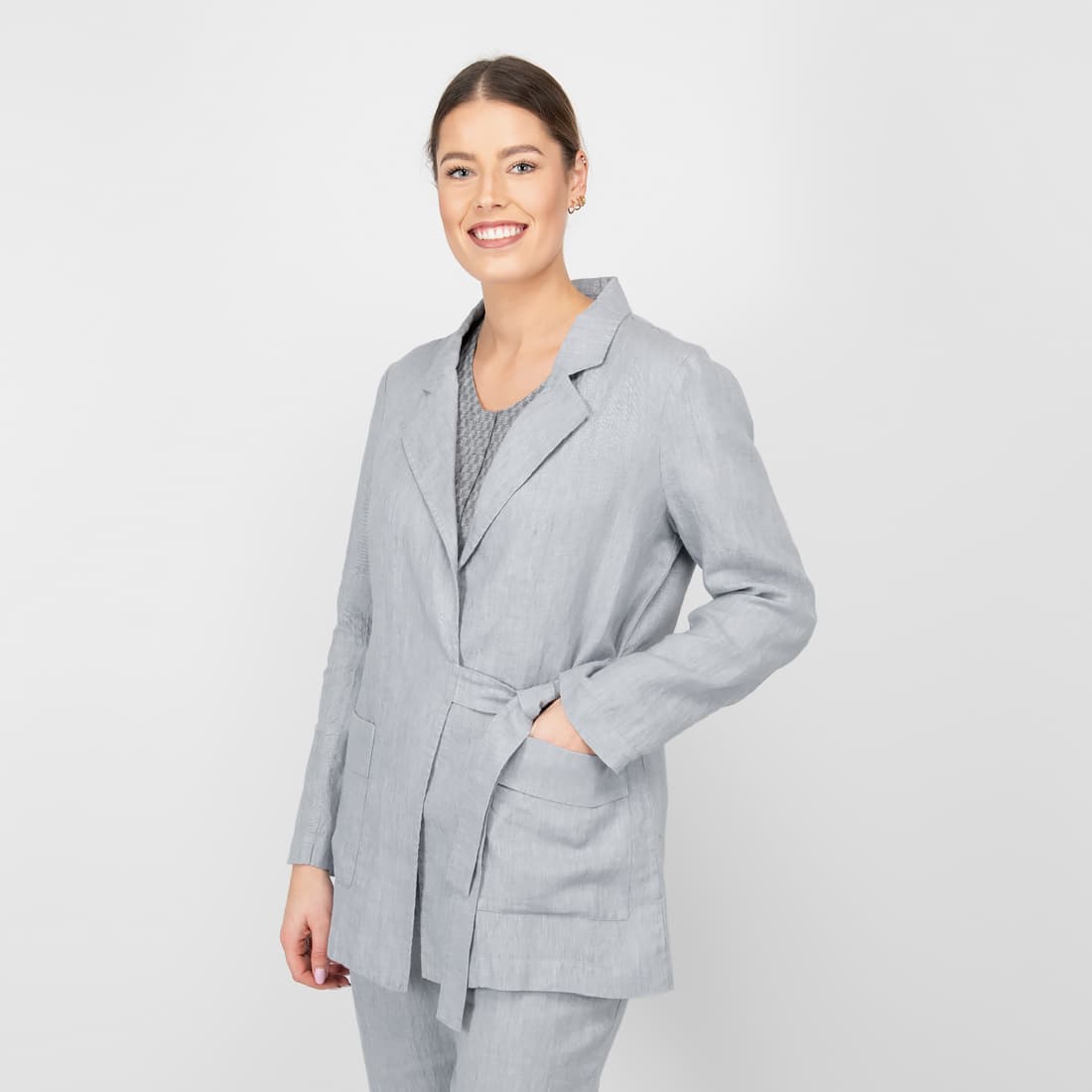 - Szczegóły: długi rękaw; kieszenie; wiązany pasek na boku