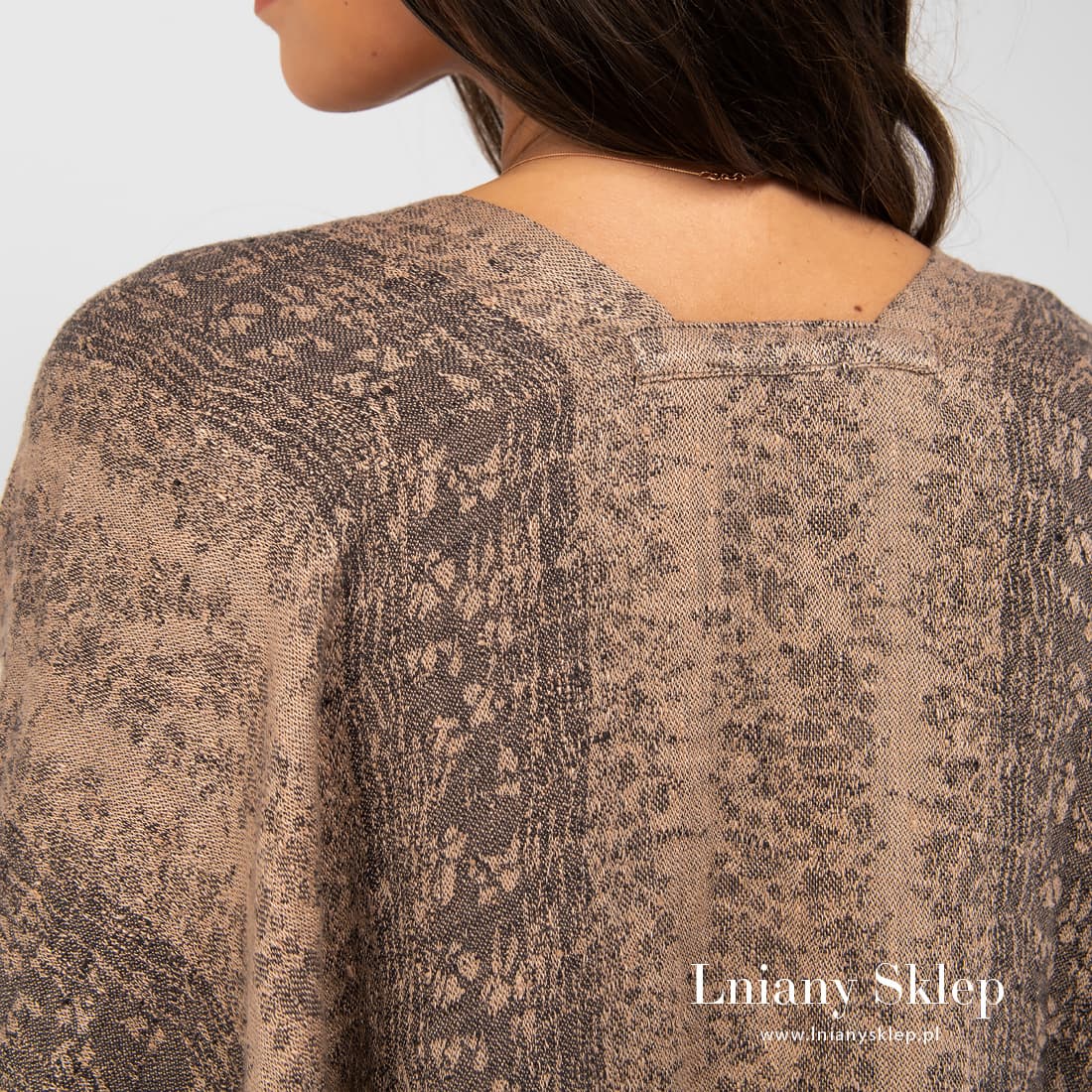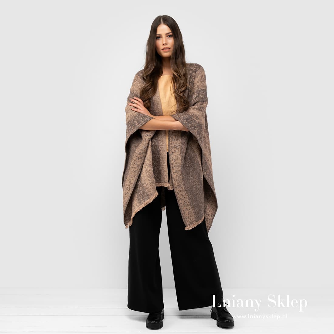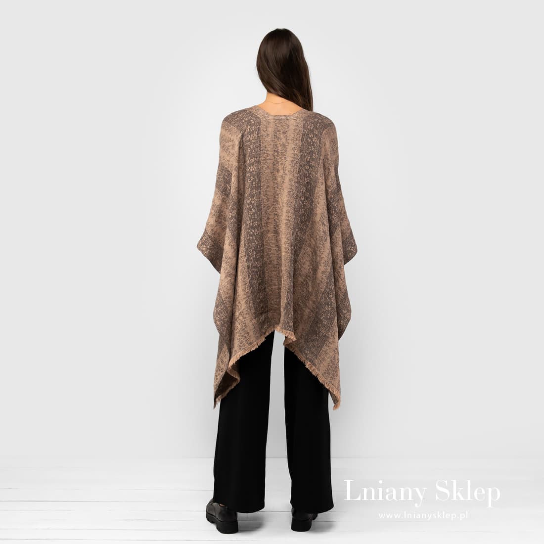 Brazowe ponczo lniane z tkaniny żakardowej wytkanej w szerokie pasy z przędzy brązowej i szarej. Dół poncza zdobią fantazyjne brązowe frędzle. Narzucić ponczo można zarówno na lekką bluzeczkę jak i na cieplejsze palto. Wyglądaj modnie i nie marznij!