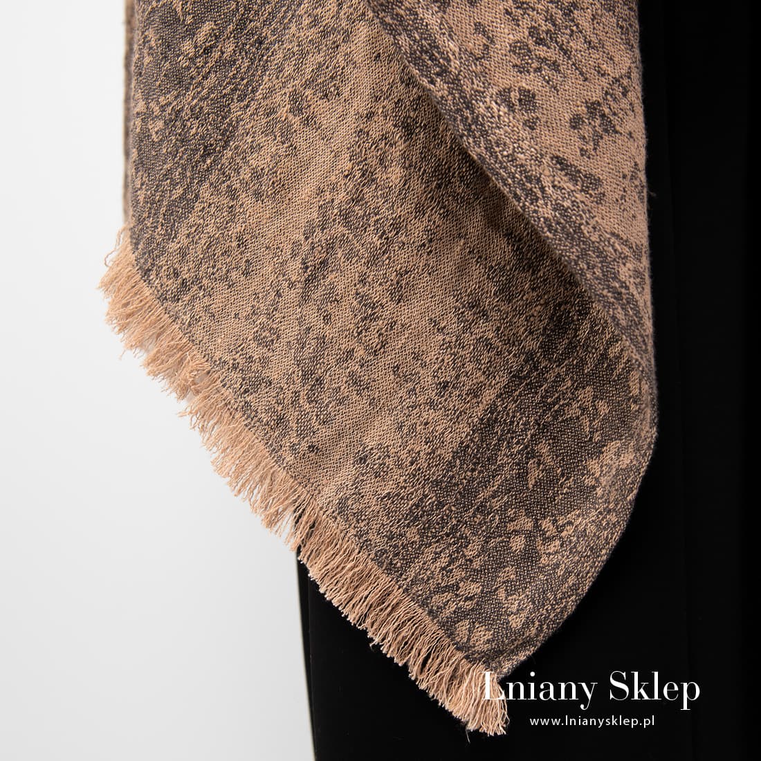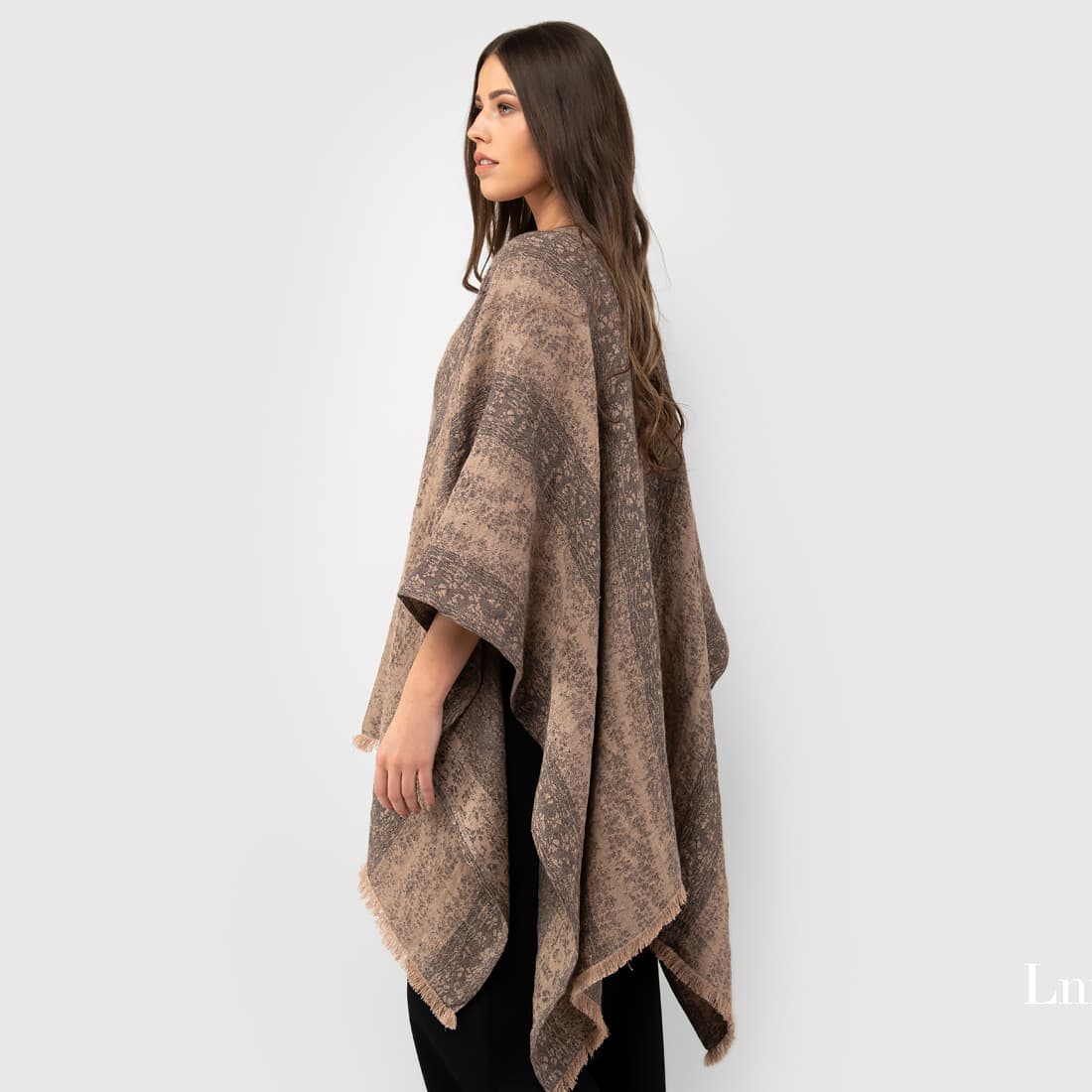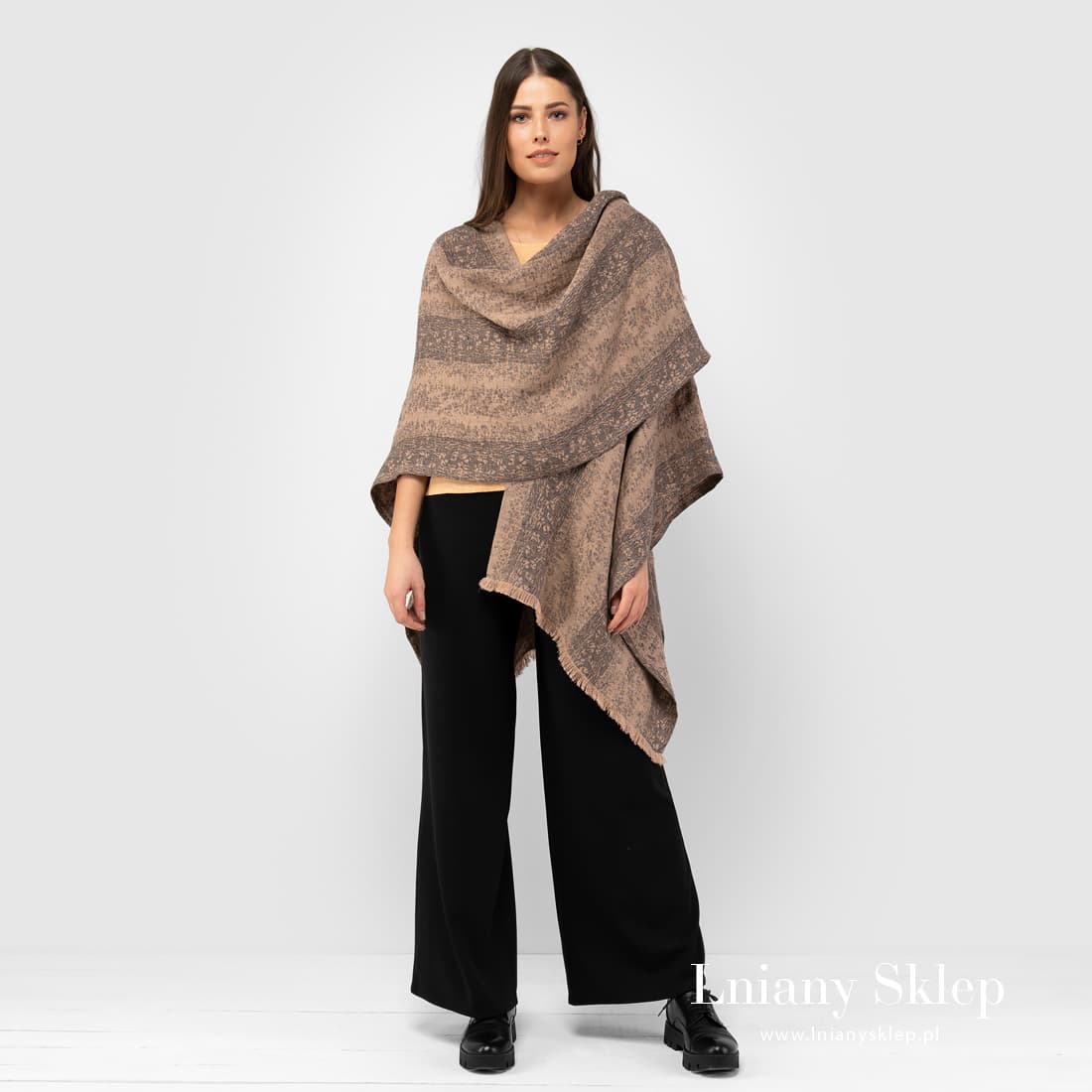 Brazowe ponczo lniane z tkaniny żakardowej wytkanej w szerokie pasy z przędzy brązowej i szarej. Dół poncza zdobią fantazyjne brązowe frędzle. Narzucić ponczo można zarówno na lekką bluzeczkę jak i na cieplejsze palto. Wyglądaj modnie i nie marznij!
