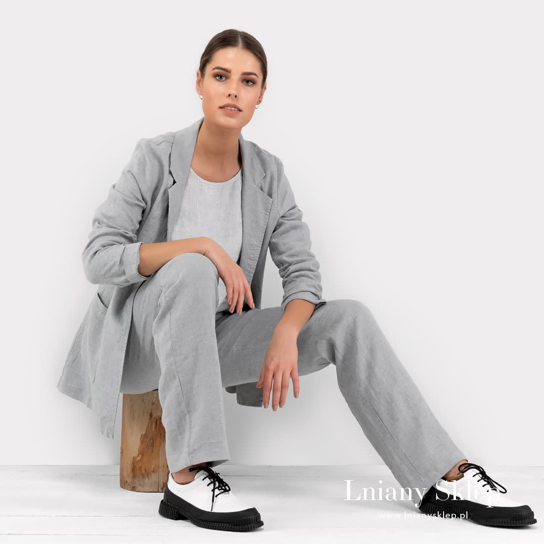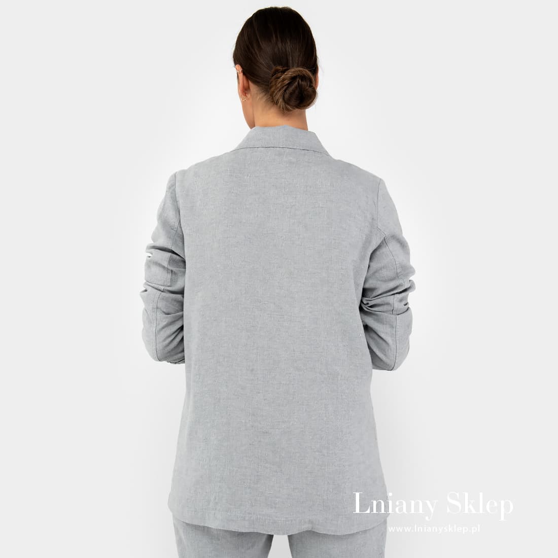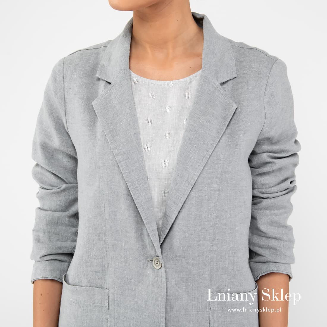 VERONA żakiet stalowo szary uszyty z tkaniny wytkanej z przędzy o dwóch różnych szaro – niebieskich odcieniach. Lekki żakiecik lniany na każdy chłodniejszy wieczór letni. Dopasuj go do dłuższych lub skróconych spodni VERONA z identycznej tkaniny z naszej kolekcji. Lniany żakiet – uniwersalna część garderoby letniej!