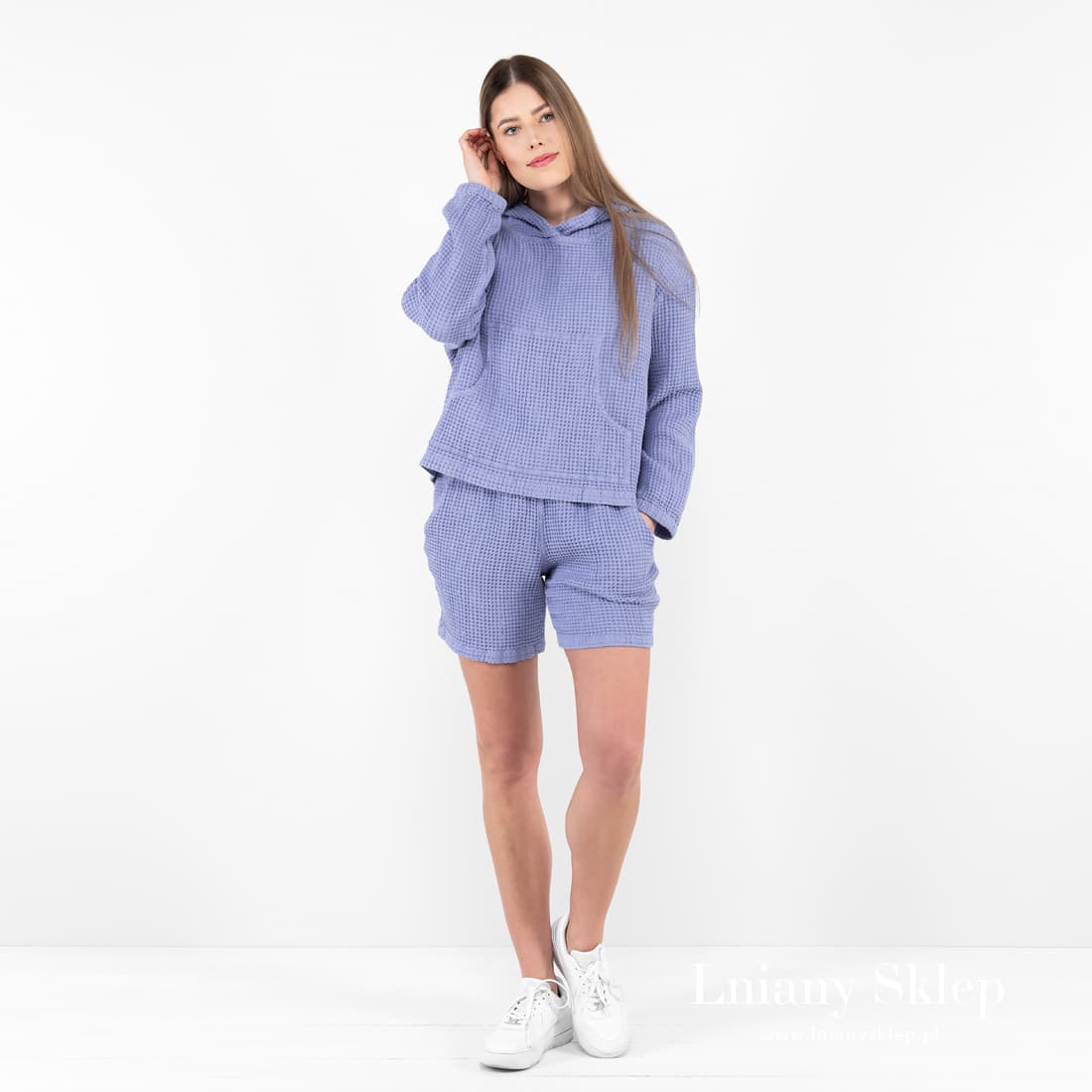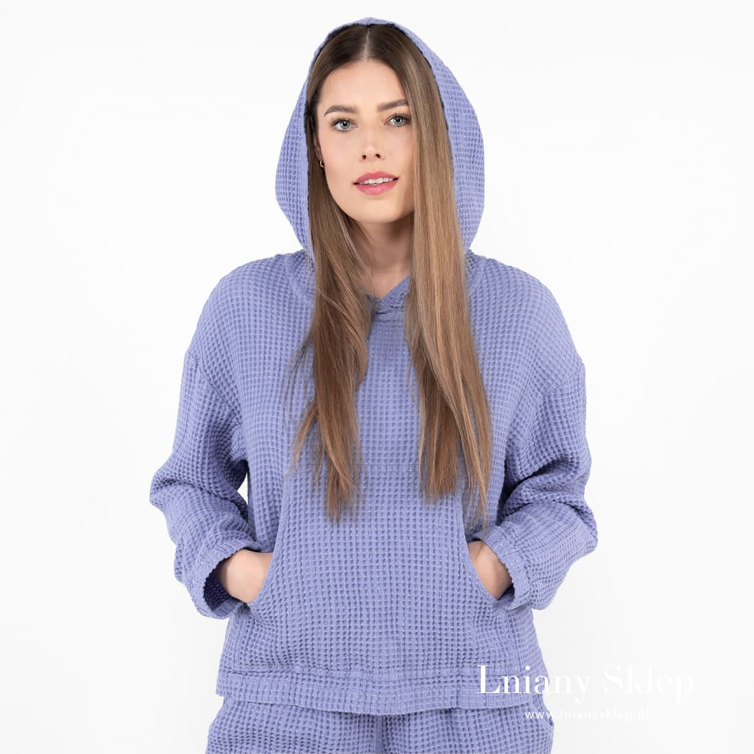 - Szczegóły: długi rękaw, kaptur, duża kieszeń z przodu