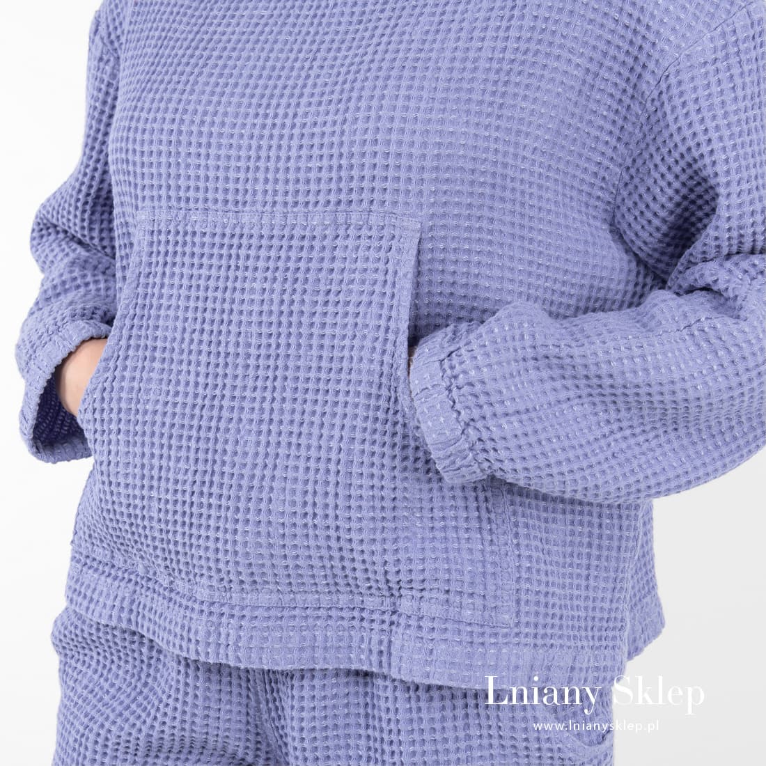 - Kolor: melanżowo wytkana tkanina z niebieskiej (przylaszczka) i błękitnej przędzy