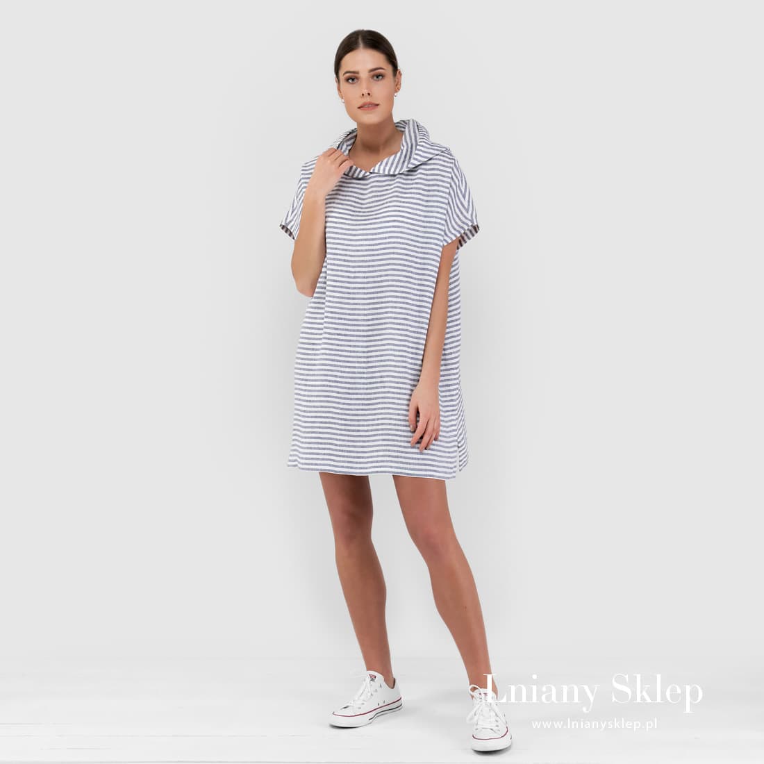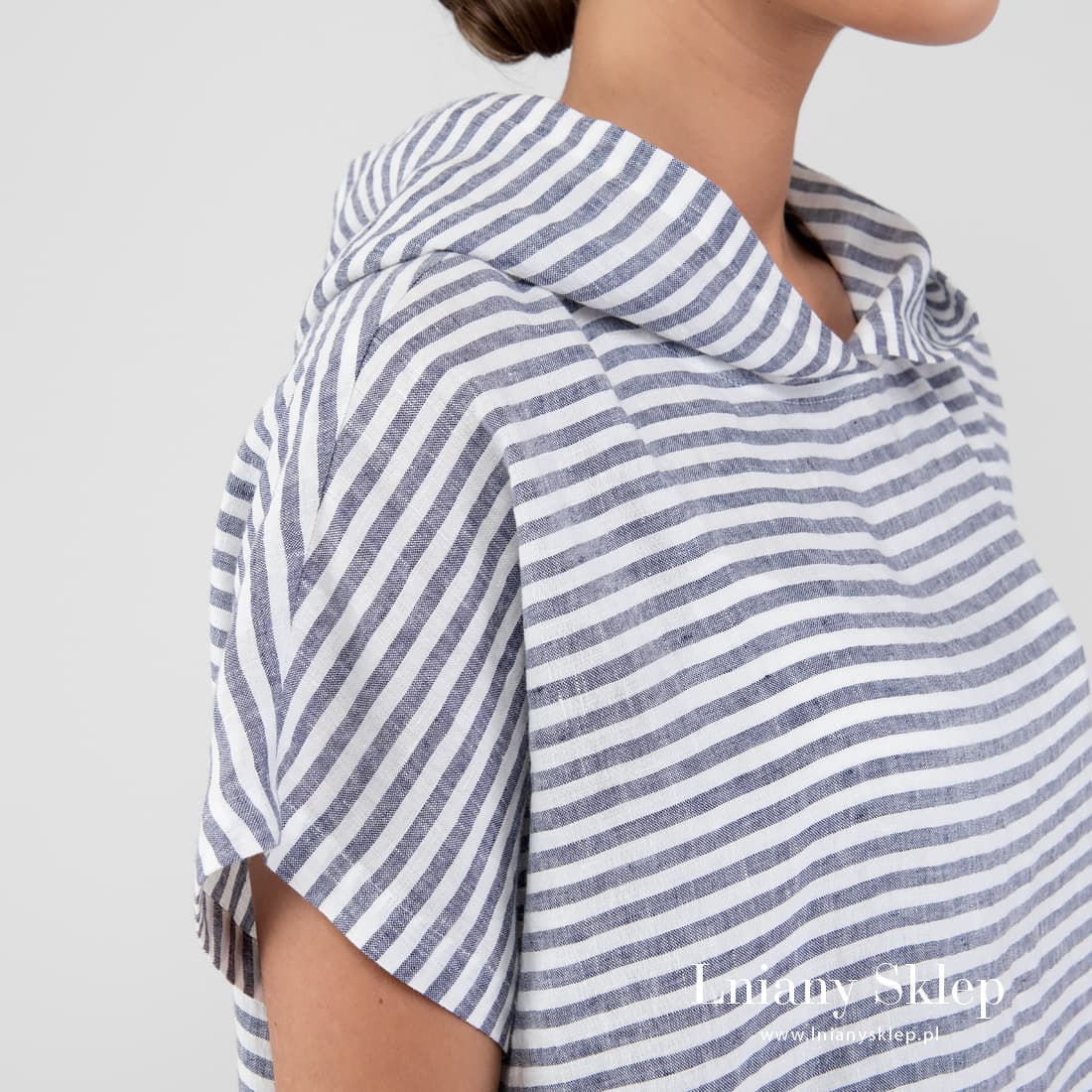 Ponczo na plażę z tkaniny 100% lnianej wytkanej w poziome wąskie granatowe i białe paski. Ponczo krótkie, ma krótkie rękawy i rozporki na bokach. Duży kaptur ochroni przed słońcem, ukryje mokre włosy. Wygodny ciuszek na plażę, można go też użyć w roli sukienki w domu – narzucić go na szybko z rana.