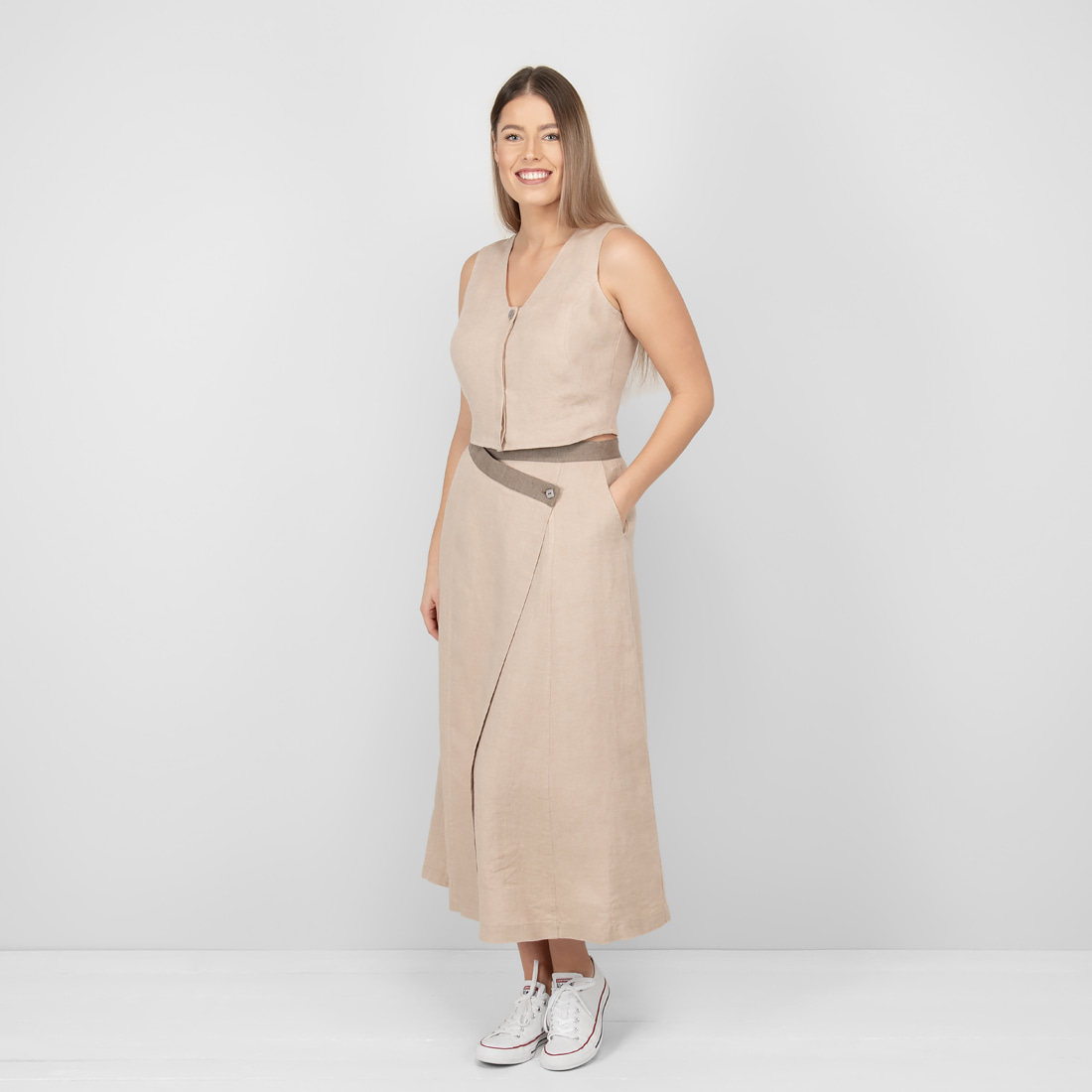 - Model: długość midi; krój „A”; z przodu zarzucana