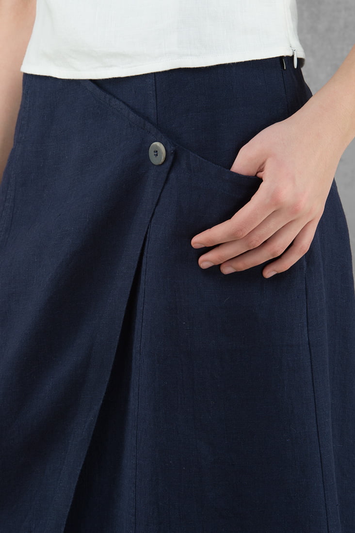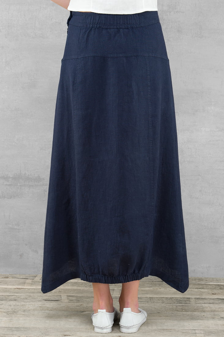Długa spódnica z dość grubej tkaniny lnianej. Elegancki granat, współczesny krój spódnicy pozwolą czuć się wygodnie, swobodnie i pięknie wiosną i upalnym latem.