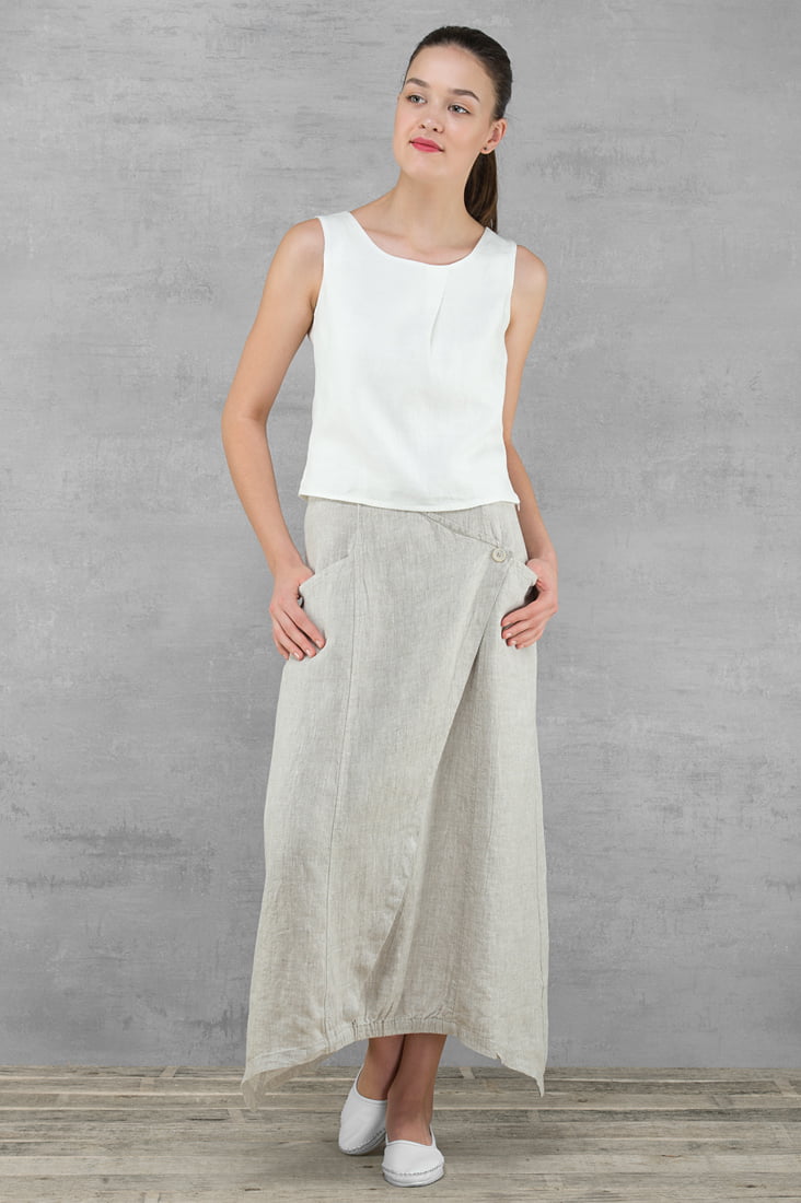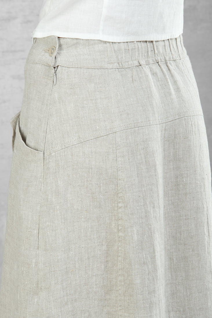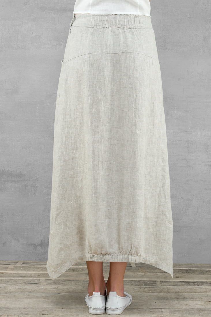 Spódnica maxi z mocnej tkaniny lnianej wytkanej z przędzy białej oraz niebarwionej (kolor włókna lnianego). Idealna spódnica dla Pań, które cenią wygodę i współczesny styl.