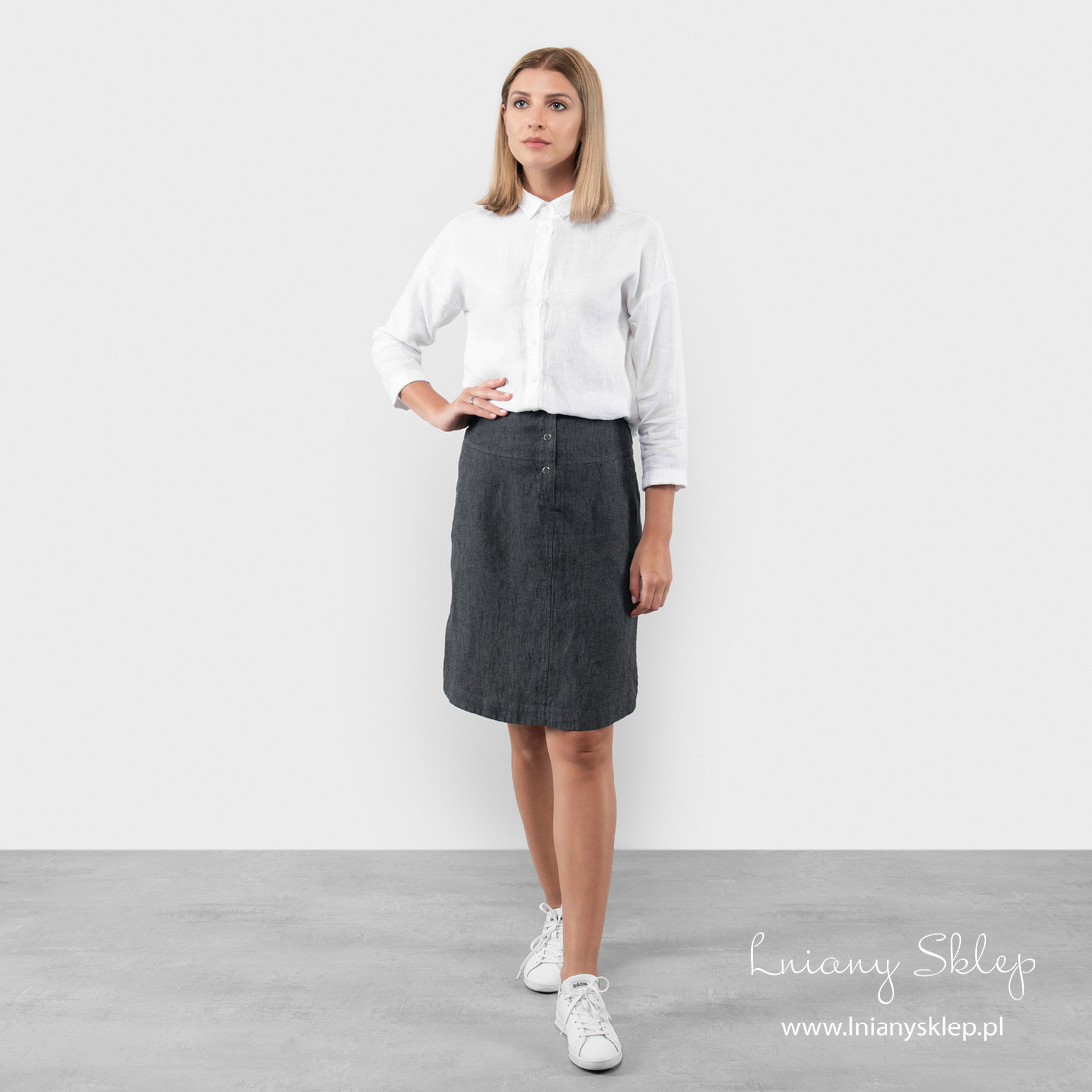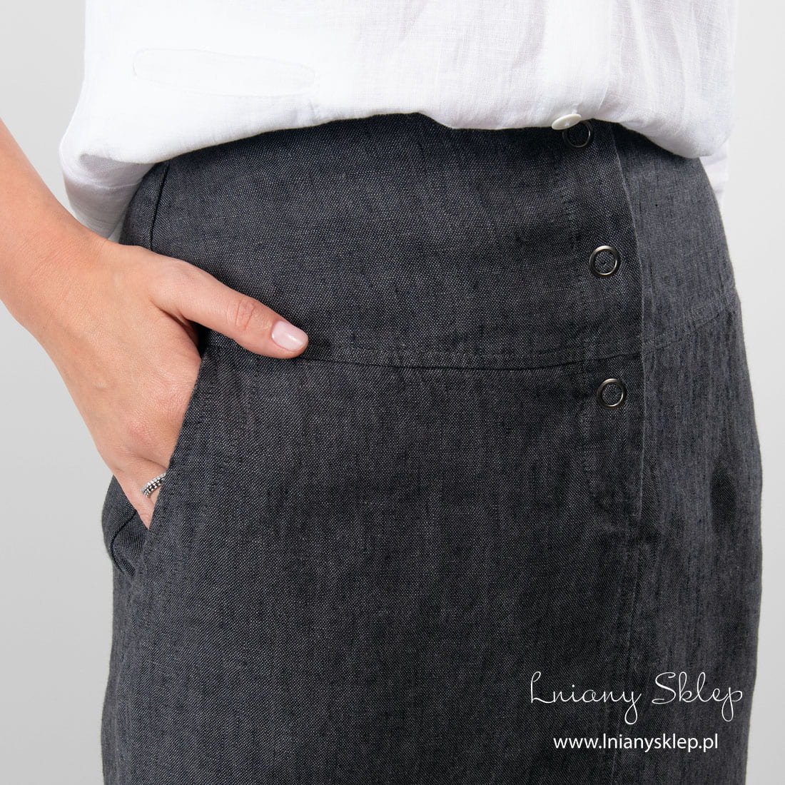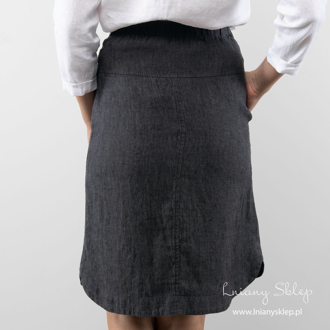 Czarna spódnica lniana z pranej tkaniny lnianej wytkanej melanżowo z przędzy czarnej i ciemnoszarej. Spódniczka w kolorze uniwersalnym – włożysz ją do bluzeczki w dowolnym kolorze! Taką spódniczkę musisz mieć!
