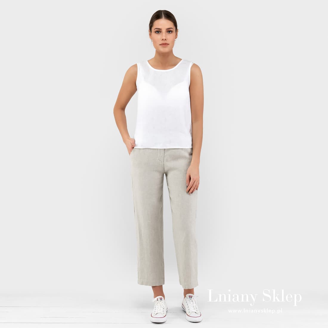 Uwaga: Do wytkania tkaniny, z której uszyto produkt, użyto niebarwionej przędzy lnianej, dlatego odcień produktu realny i widoczny na fotografii może nieco się różnić. Odcień powtórnie zamówionego produktu – z nowej partii – też może się różnić od zamówionego wcześniej.