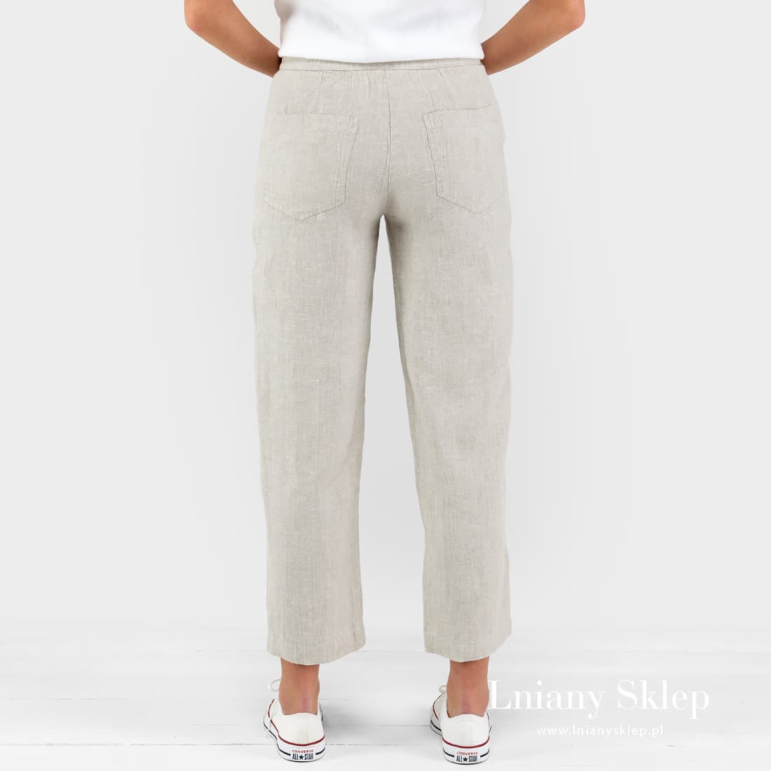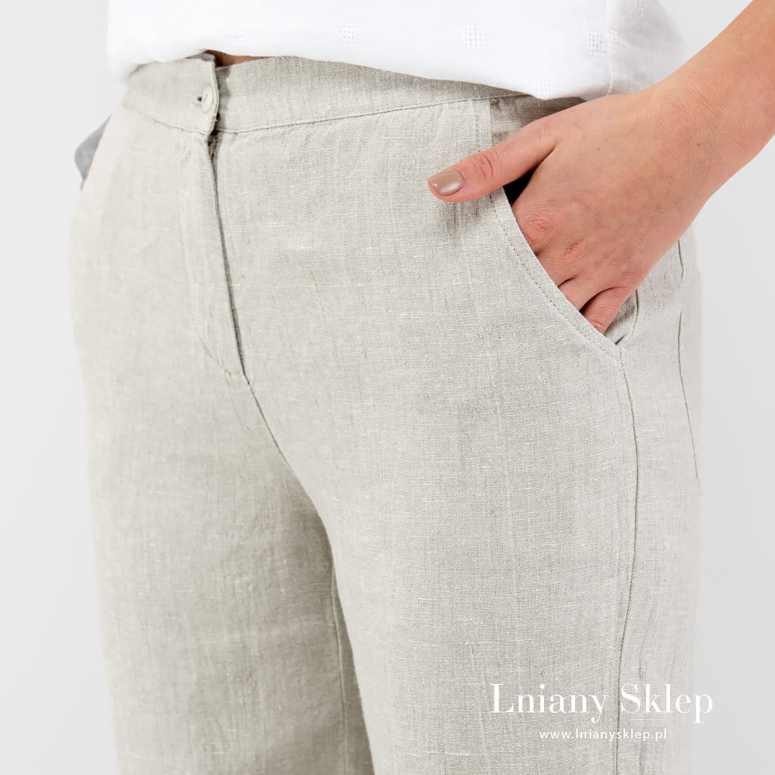 BIRMA spodnie jasne szare z tkaniny melanżowo wytkanej z przędzy niebarwionej (szarej o piaskowym odcieniu) i mlecznobiałej (lekko żółtawej). Nieco ukrócone lniane spodnie kluloty – wygodny i praktyczny element garderoby letniej. Zabierz je ze sobą / na sobie na wakacje!