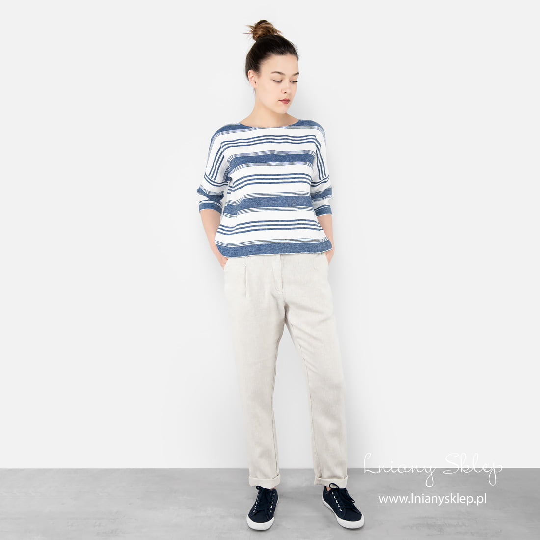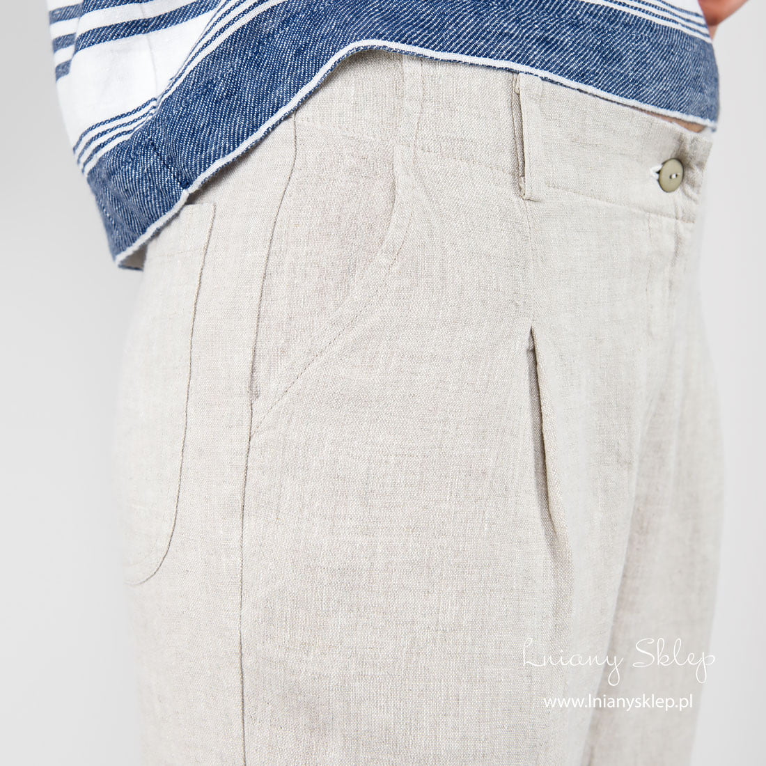 Uwaga: Do wytkania tkaniny, z której uszyto produkt, użyto niebarwionej przędzy lnianej, dlatego odcień produktu realny i widoczny na fotografii może nieco się różnić. Odcień powtórnie zamówionego produktu – z nowej partii – też może się różnić od zamówionego wcześniej.