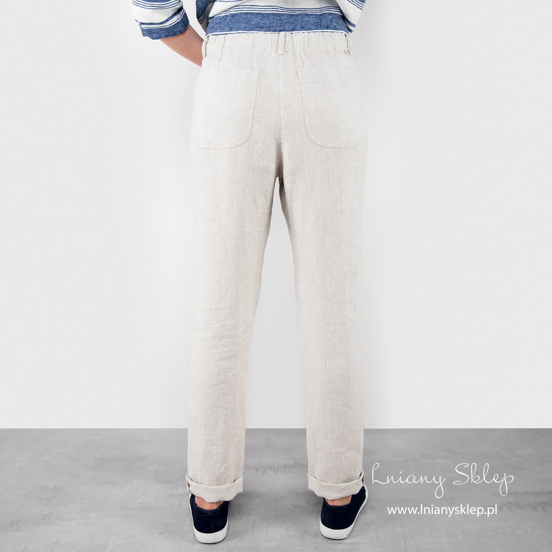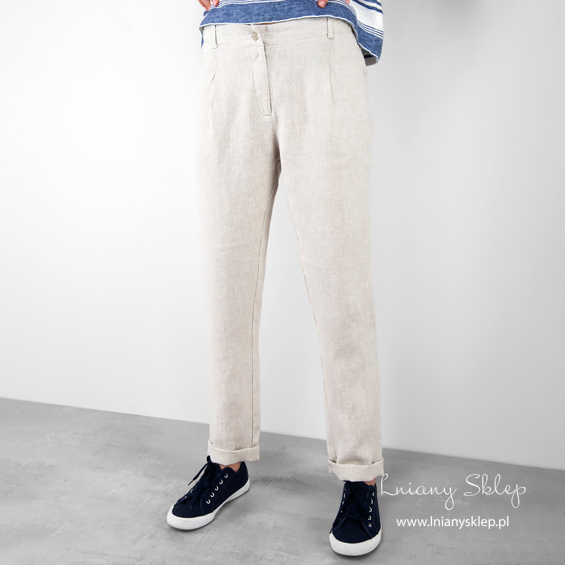Lniane jasnoszare spodnie damskie z tkaniny wytkanej z przędzy białej i niebarwionej (szarej o piaskowym odcieniu). Lniane spodnie z naturalnej, poddanej zmiękczaniu przez pranie tkaniny – idealny wybór na lato! Prana tkanina już się nie skurczy podczas kolejnych prań.