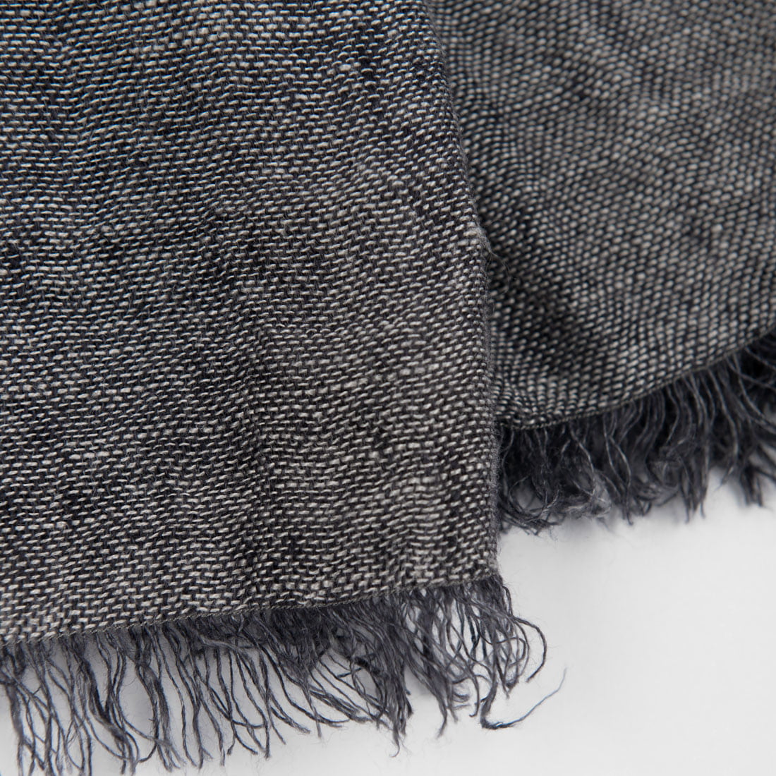 Lniany melanżowy szalik wytkany z przędzy niebarwionej (szarej) oraz czarnej. Krótsze brzegi szalika zdobią czarne frędzelki. Szalik uszyliśmy z pranego lnu – jest delikatny i przytulny. Solidny szalik z miękkiego lnu podkreśli współczesną elegancję Twego stroju.