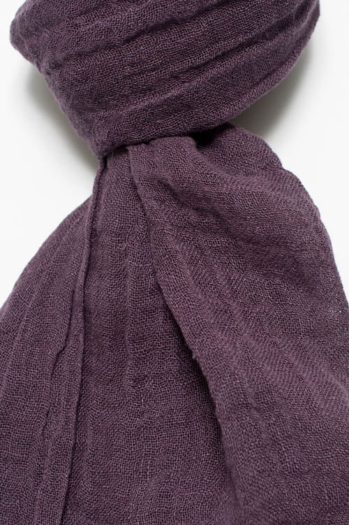 Cieniutki ciemnofioletowy lniany szalik wykończony strzępionymi brzegami - frędzelkami o długości 2 cm. Modny i elegancki dodatek na wiosnę i lato.