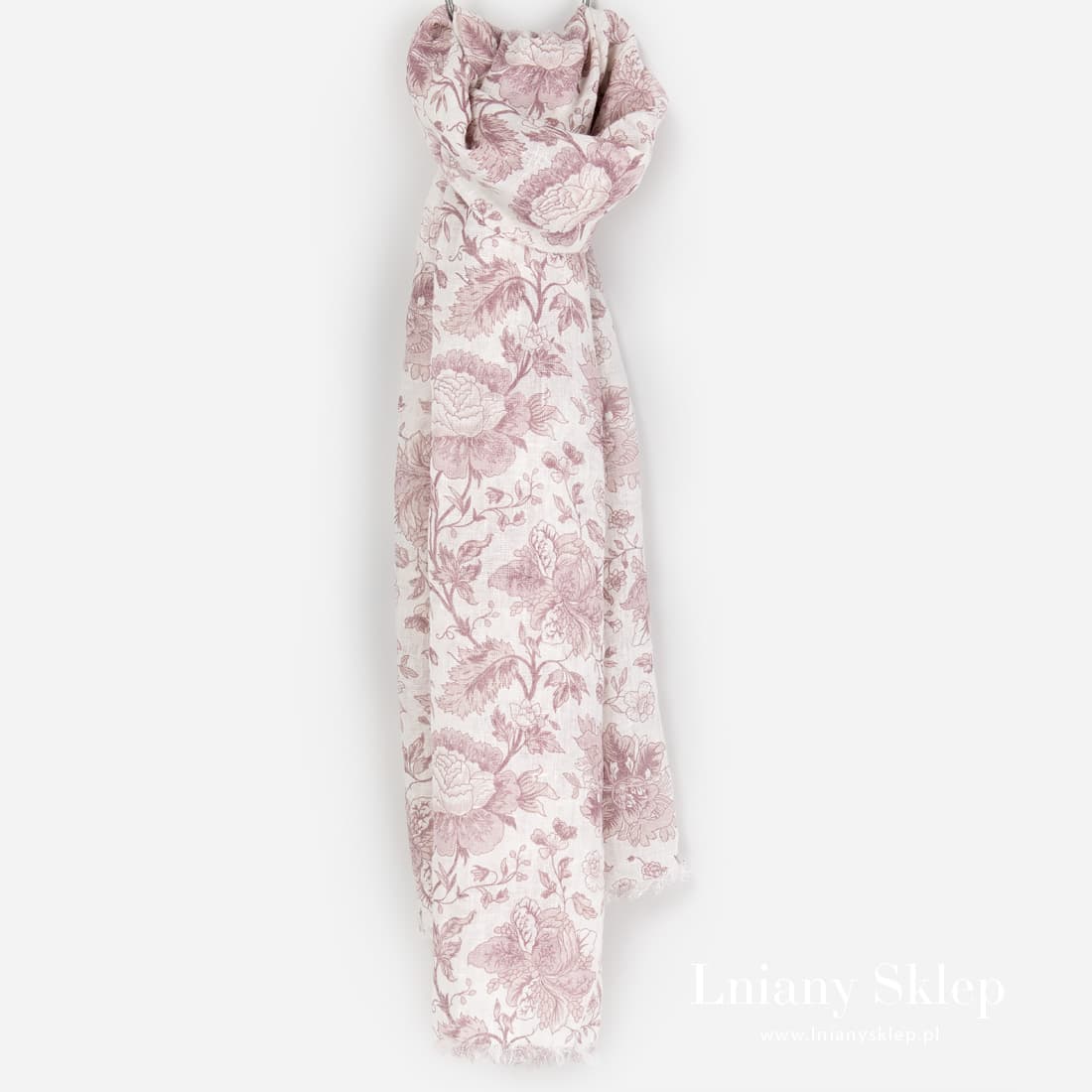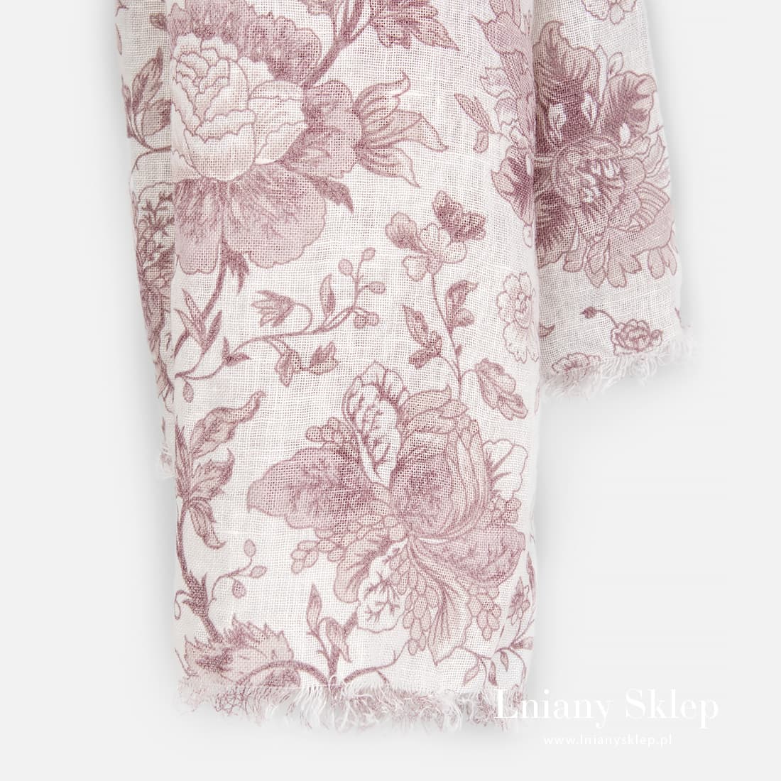 Lniany szalik w różowe kwiaty malowane na białym tle. Uszyty z pranej tkaniny 100% lnianej, na krótszych brzegach ozdobiony strzępionymi frędzelkami. Lniany szalik tak się przyda chłodniejszym letnim wieczorem. Skuś się! Łap go!